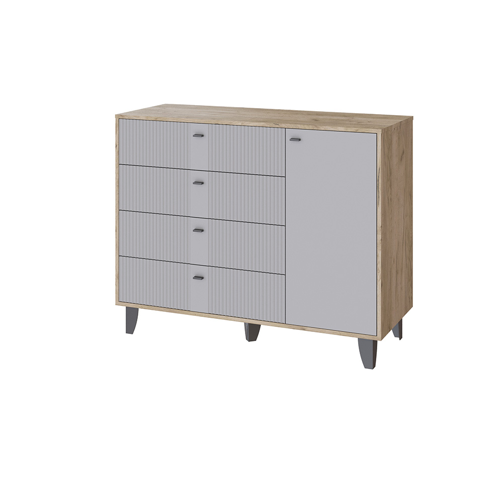 Комод Катрин-13 — это стильный и функциональный элемент интерьера, который станет отличным дополнением к вашей спальне или гостиной. Он выполнен в современном стиле и имеет комбинированную конструкцию, четыре выдвижных ящика и полки за распашными фасадами.