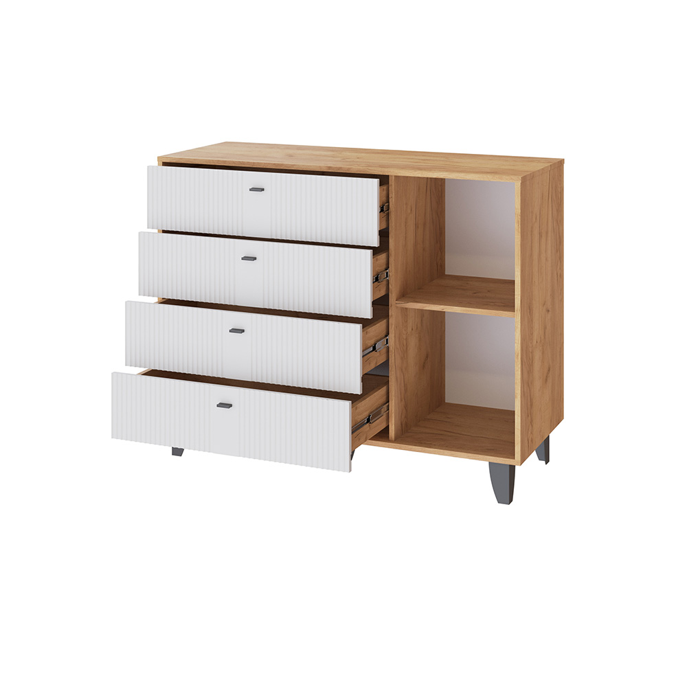 Комод Катрин-13 — это стильный и функциональный элемент интерьера, который станет отличным дополнением к вашей спальне или гостиной. Он выполнен в современном стиле и имеет комбинированную конструкцию, четыре выдвижных ящика и полки за распашными фасадами.
