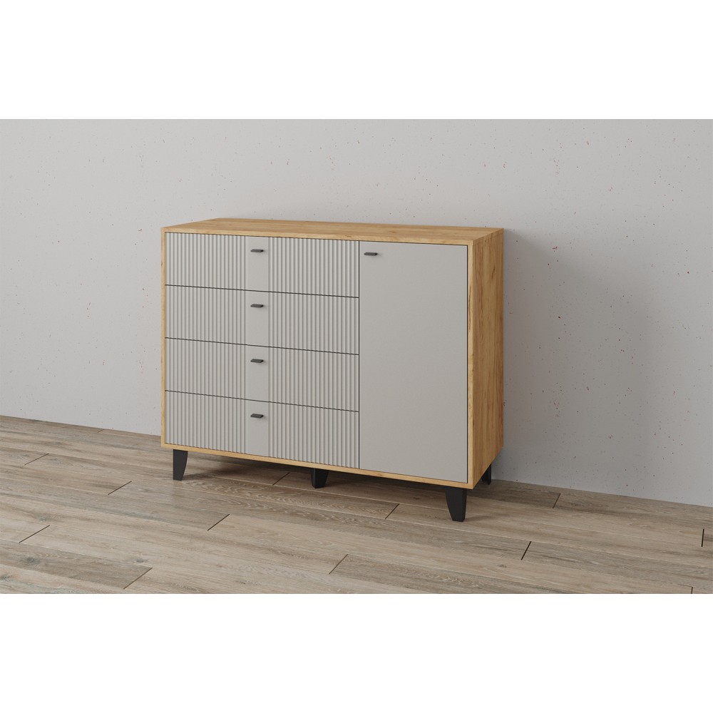 Комод Катрин-13 — это стильный и функциональный элемент интерьера, который станет отличным дополнением к вашей спальне или гостиной. Он выполнен в современном стиле и имеет комбинированную конструкцию, четыре выдвижных ящика и полки за распашными фасадами.