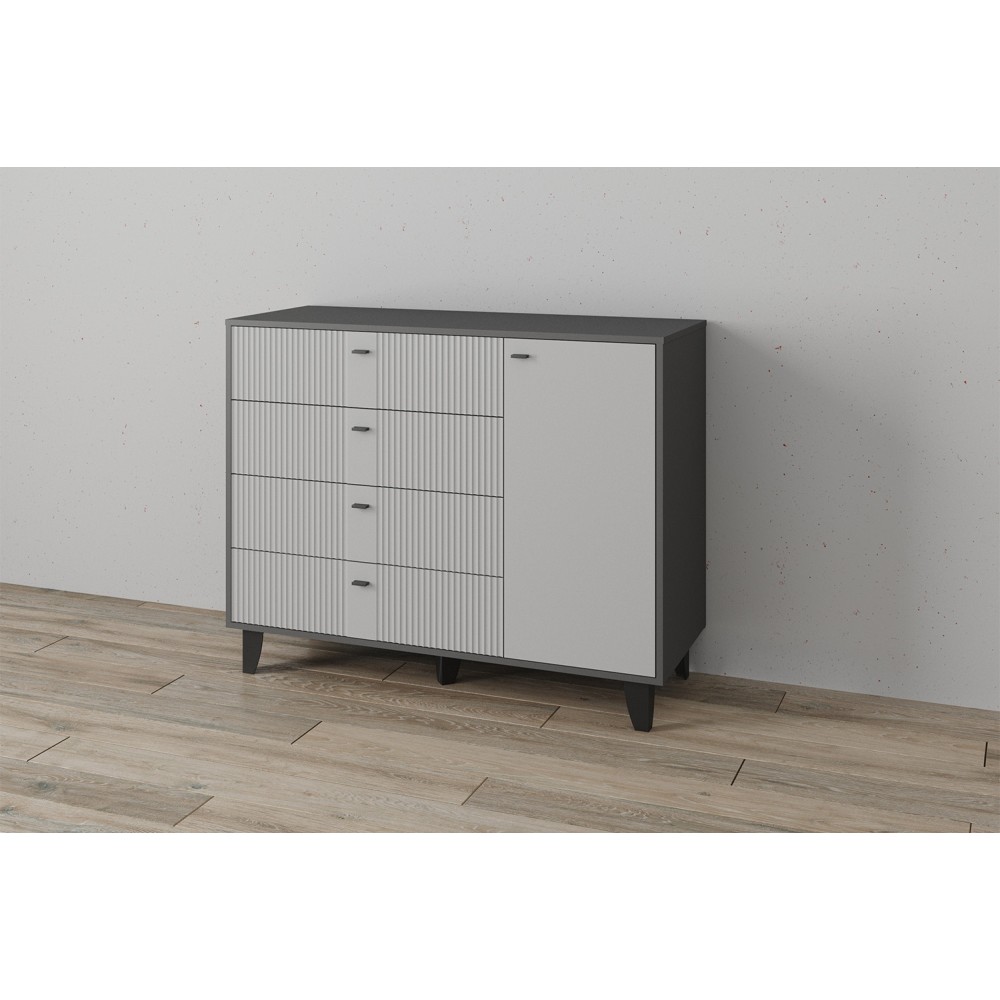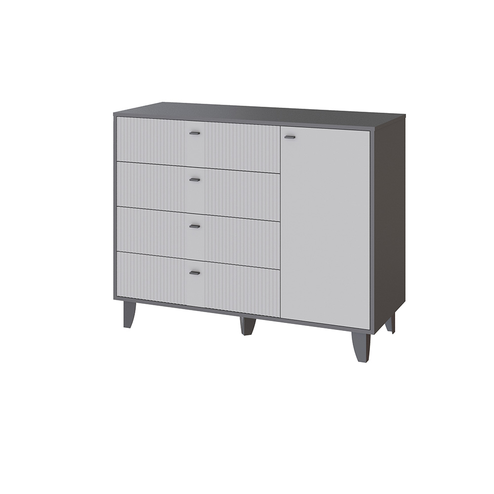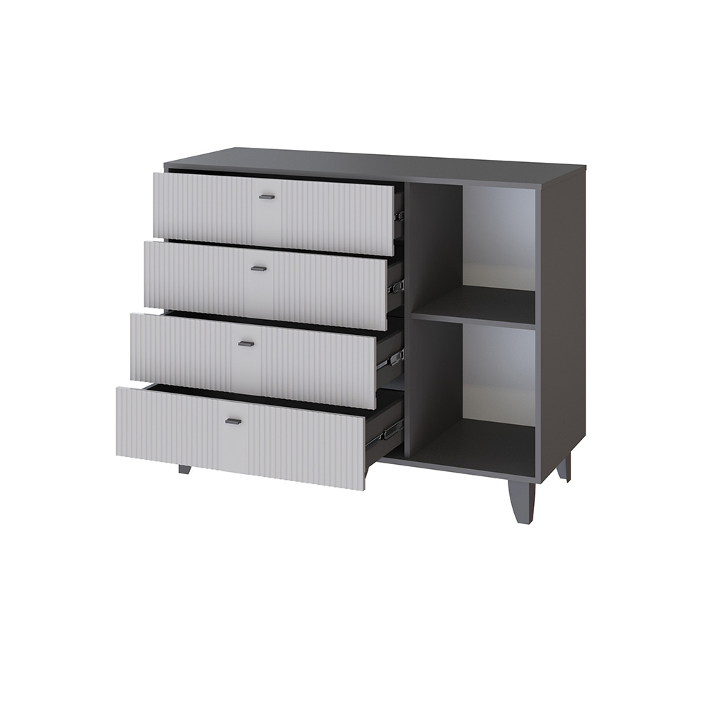 Комод Катрин-13 — это стильный и функциональный элемент интерьера, который станет отличным дополнением к вашей спальне или гостиной. Он выполнен в современном стиле и имеет комбинированную конструкцию, четыре выдвижных ящика и полки за распашными фасадами.
