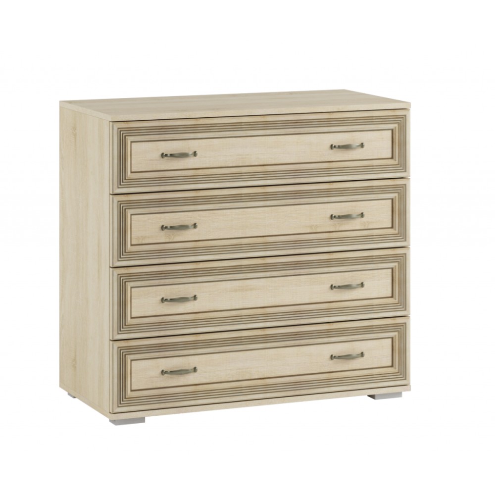 Классический комод с четырьмя выдвижными ящиками, каждый из которых оснащен двумя ручками для аккуратного открывания. Вместительный и небольшой вариант для хранения белья.Материал фасада:Рамочный профиль из МДФ, 3D-вставка из МДФ.Материал корпуса:ЛДСП.Фурнитура:«Старая бронза» 96 мм.Установлены петли с доводчиками для бесшумного закрывания и шариковые направляющие полного выдвижения.