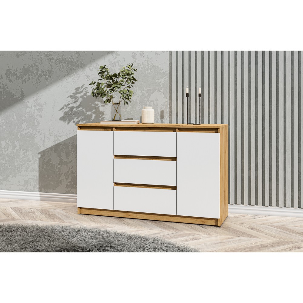 Комод с ящиками из модульной серии Денвер дополнит современный интерьер комнаты. Три вместительных ящика и полки за распашными дверьми позволят организовать место хранения белья и одежды, аксессуаров и других нужных предметов.