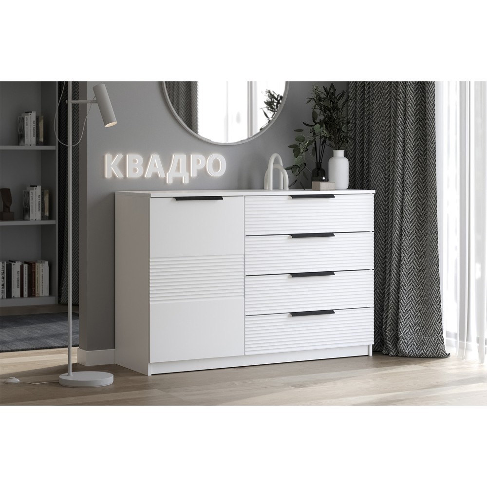 Комод с ящиками из модульной серии Квадро дополнит современный интерьер комнаты. Четыре вместительных ящика и полки за распашной дверью позволят организовать место хранения белья и одежды, аксессуаров и других нужных предметов.