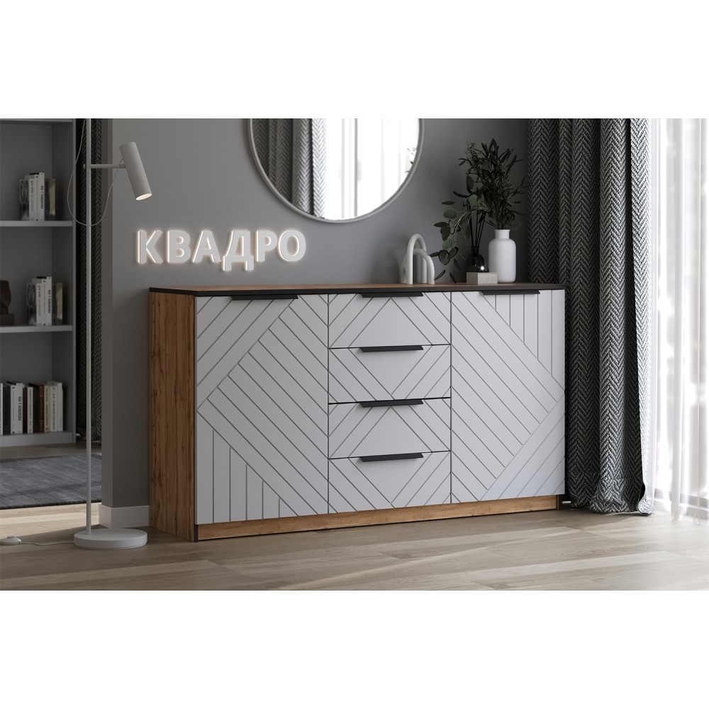 Комод с ящиками из модульной серии Квадро дополнит современный интерьер комнаты. Четыре вместительных ящика и полки за распашыми дверцами позволят организовать место хранения белья и одежды, аксессуаров и других нужных предметов.