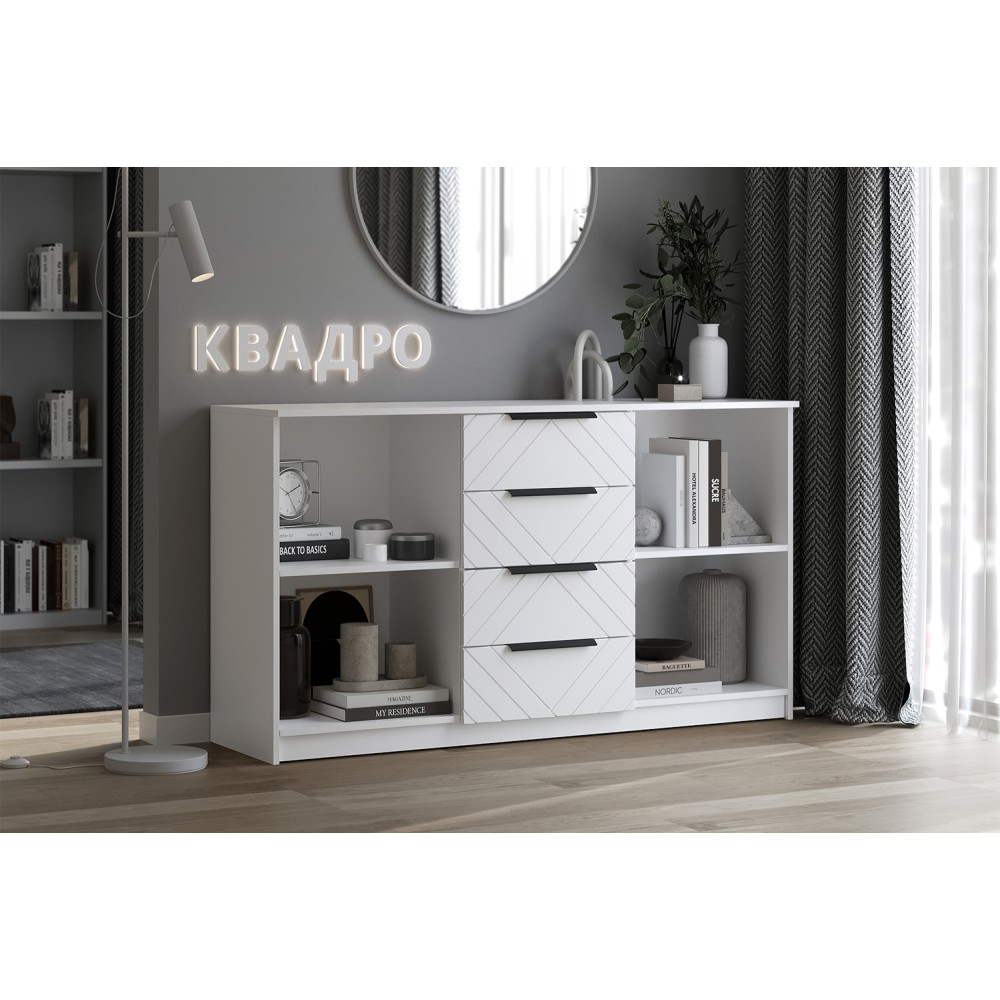 Комод с ящиками из модульной серии Квадро дополнит современный интерьер комнаты. Четыре вместительных ящика и полки позволят организовать место хранения белья и одежды, аксессуаров и других нужных предметов.