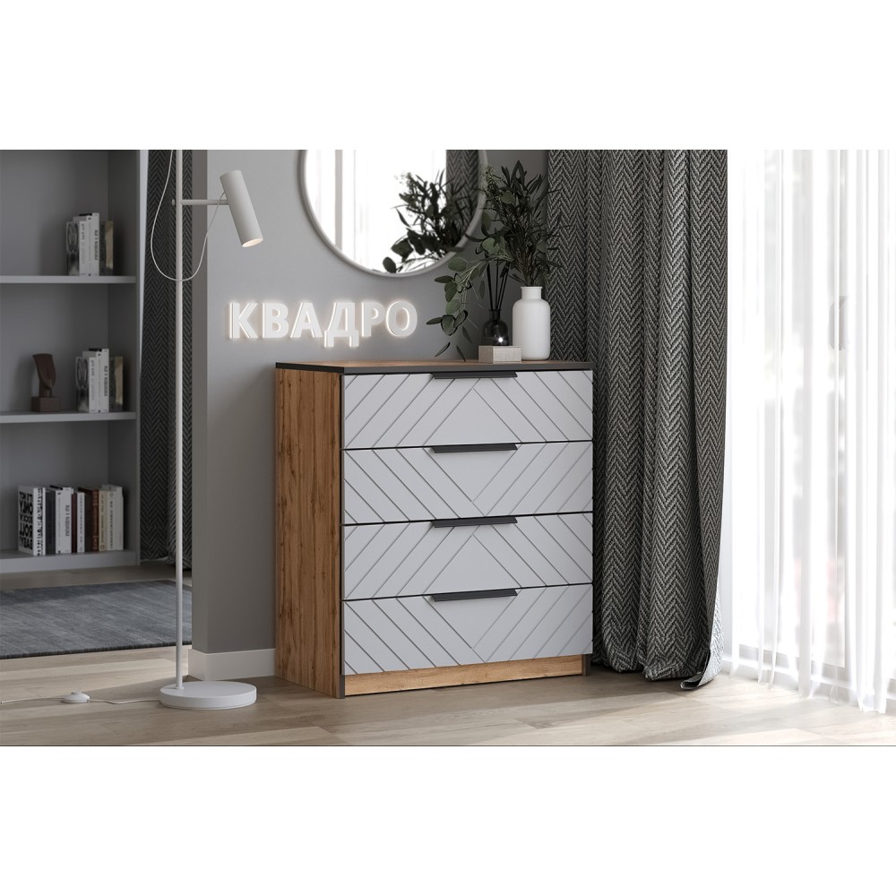 Комод с ящиками из модульной серии Квадро дополнит современный интерьер комнаты. Четыре вместительных ящика позволят организовать место хранения белья и одежды, аксессуаров и других нужных предметов.