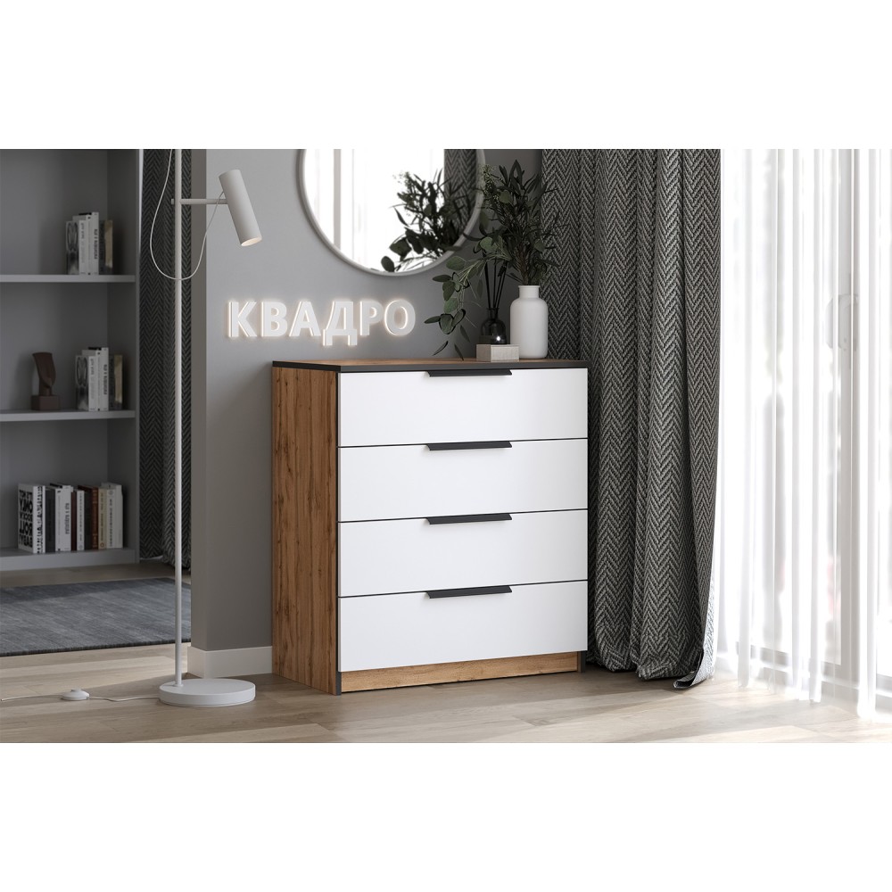 Комод с ящиками из модульной серии Квадро дополнит современный интерьер комнаты. Четыре вместительных ящика позволят организовать место хранения белья и одежды, аксессуаров и других нужных предметов.