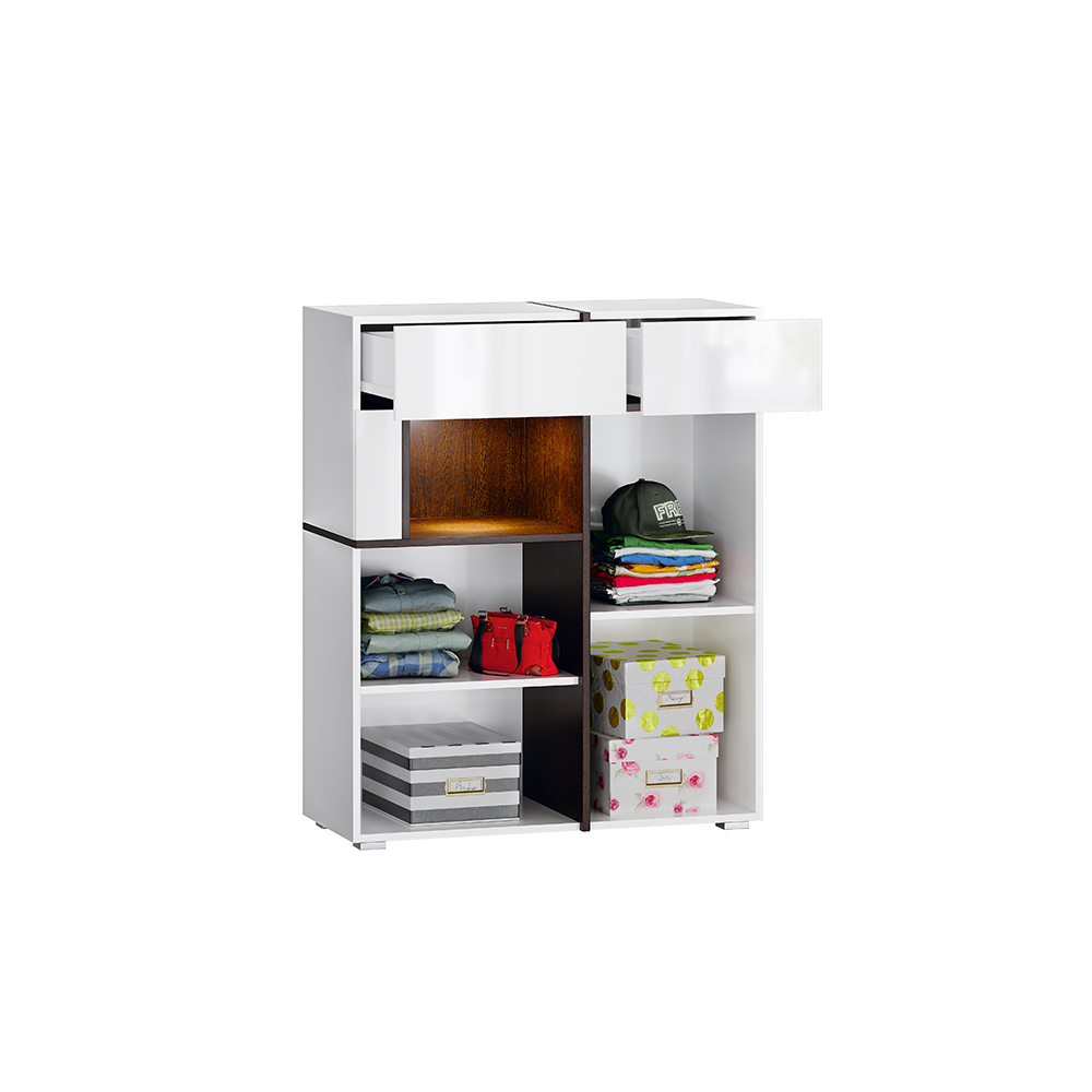 Комод из модульной серии Мадера дополнит современный интерьер комнаты. Вместительные ящики и полки за распашными дверьми позволят организовать место хранения белья и одежды, аксессуаров и других нужных предметов.