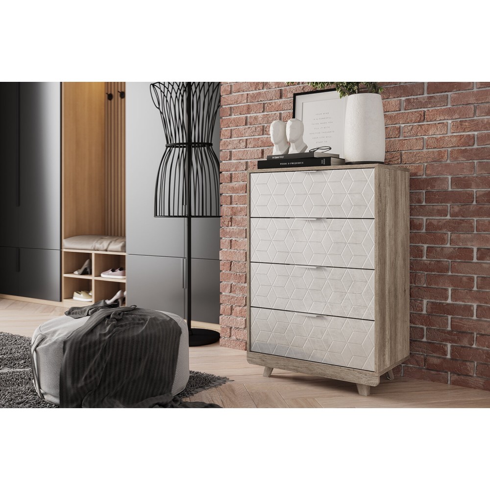 Отличительная черта комодов серии Мегаполис – сочетание теплого оттенка дерева и оригинальной фрезеровки. На таких поверхностях не видно пыли и грязи, что является огромным плюсом для домохозяек. Модель КМ-02 имеет четыре ящика на шариковых направляющих.