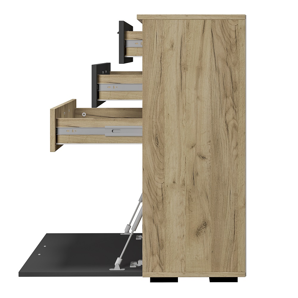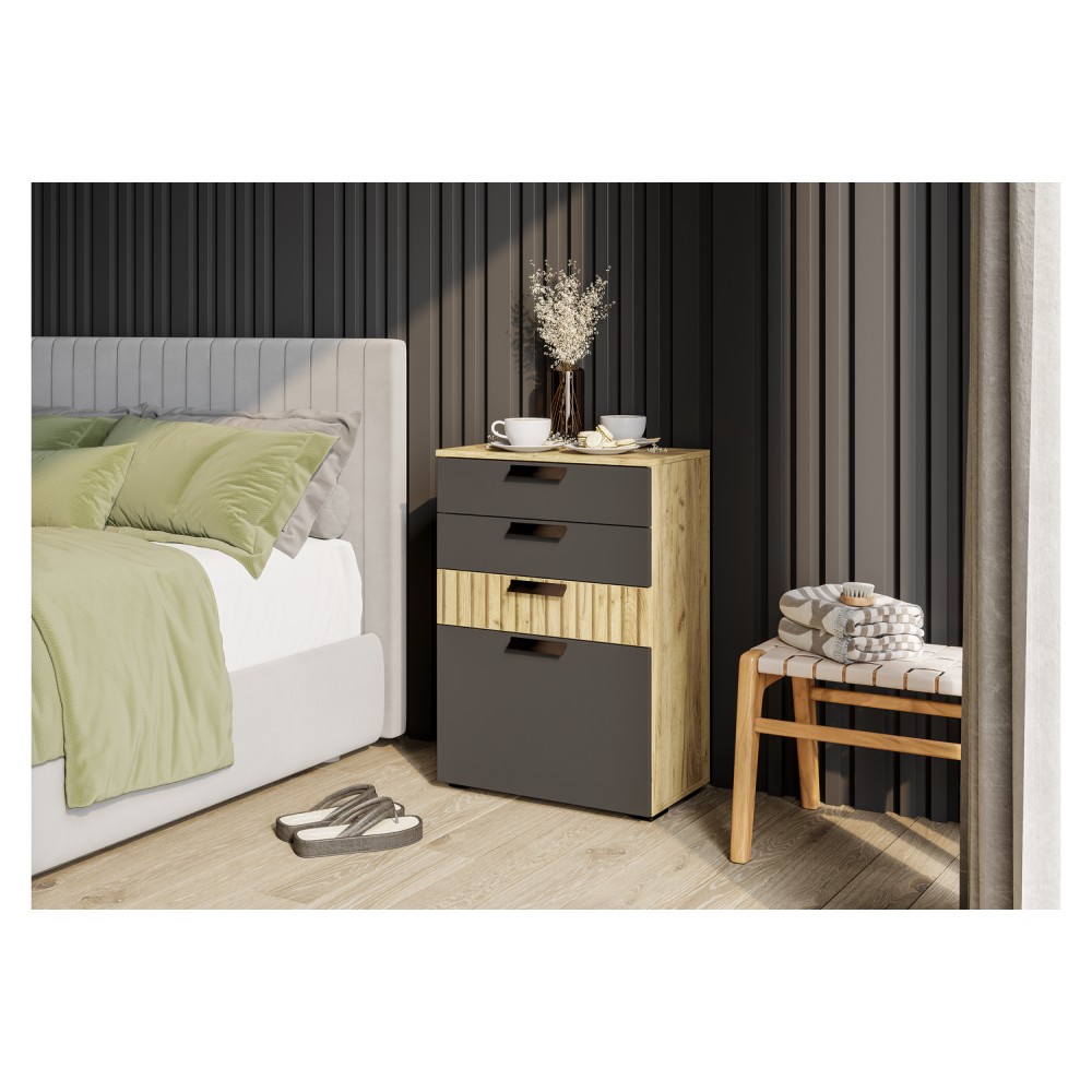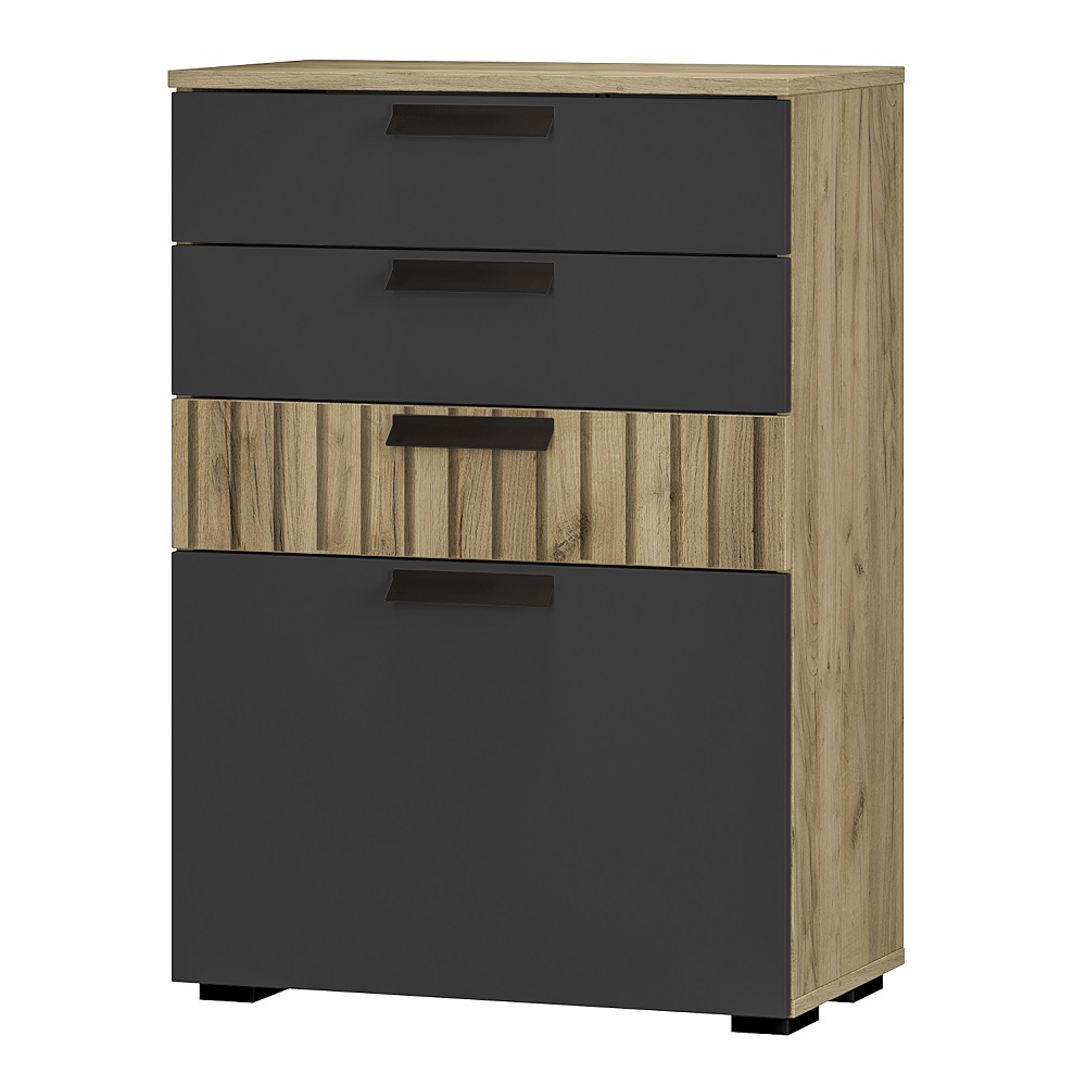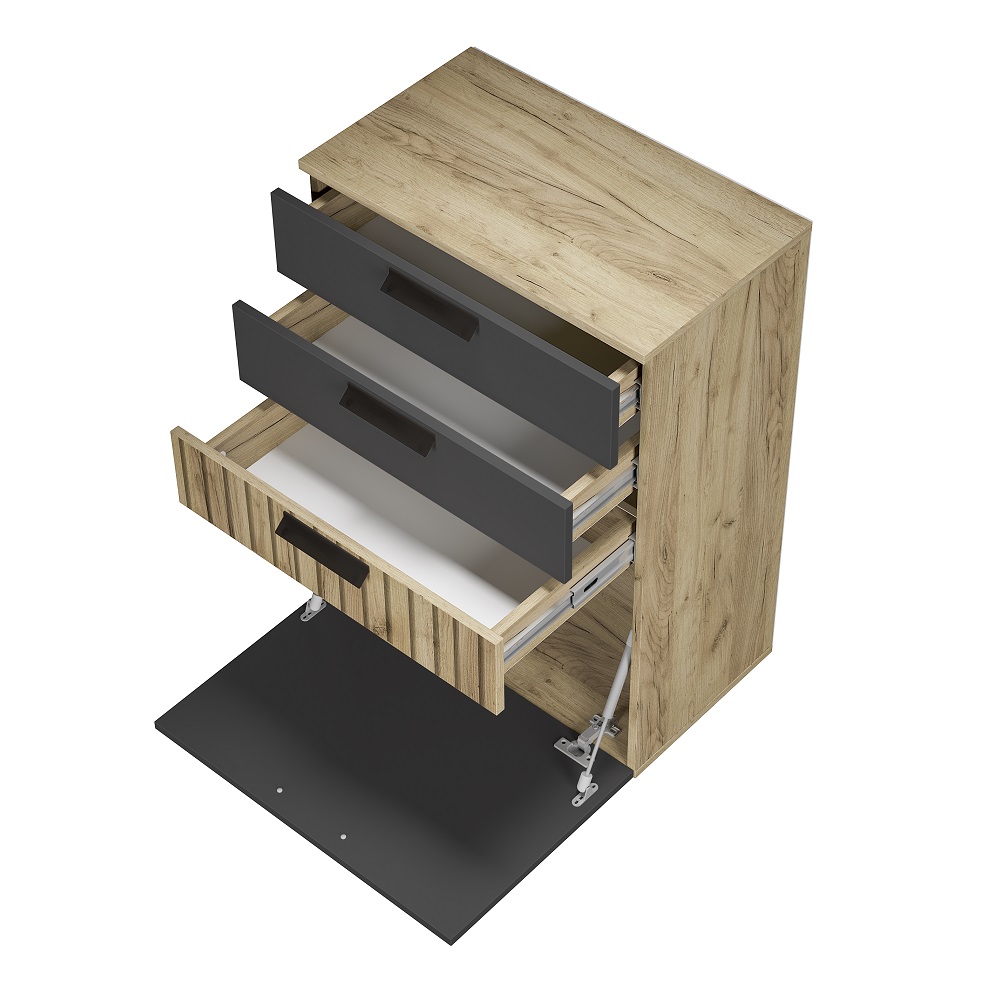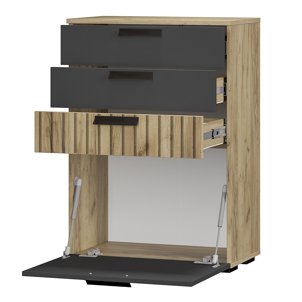 Комод «Мишель тип 1» КМ-12 в цветах «крафт» и «графит» — это стильный и функциональный элемент мебели для гостиной. Он имеет универсальный дизайн, который прекрасно впишется в современный интерьер. Фасад комода выполнен в глубоком оттенке «графит», который контрастирует с холодными цветами стен. Корпус и поверхности выполнены в цвете «крафт», что создаёт гармоничное сочетание с фотопечатью, имитирующей деревянные рейки.