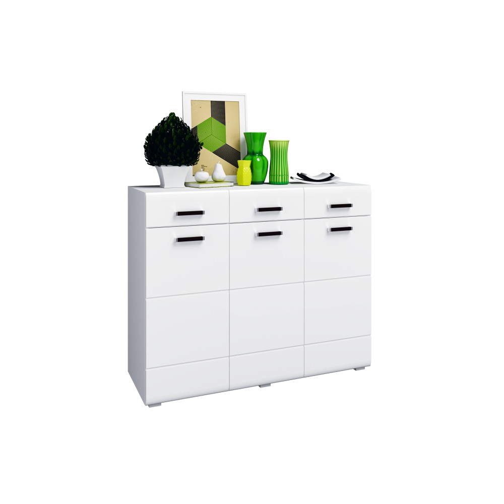 Комод из модульной серии Нэнси дополнит современный интерьер комнаты. Вместительные ящики и полки за распашными дверьми позволят организовать место хранения белья и одежды, аксессуаров и других нужных предметов.