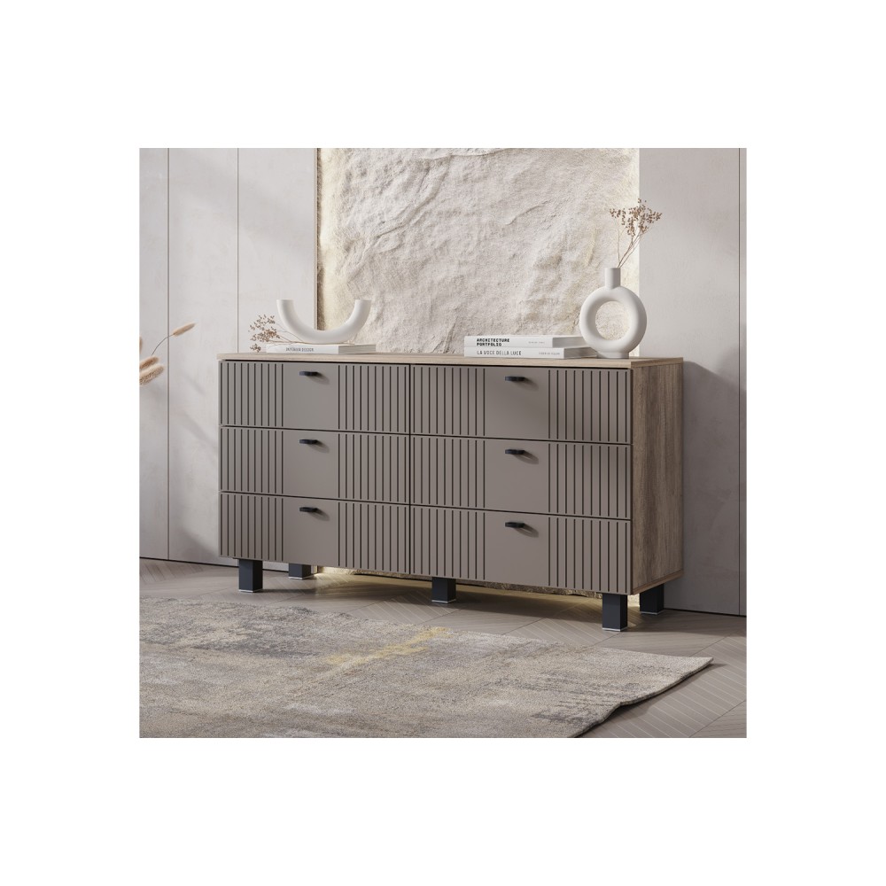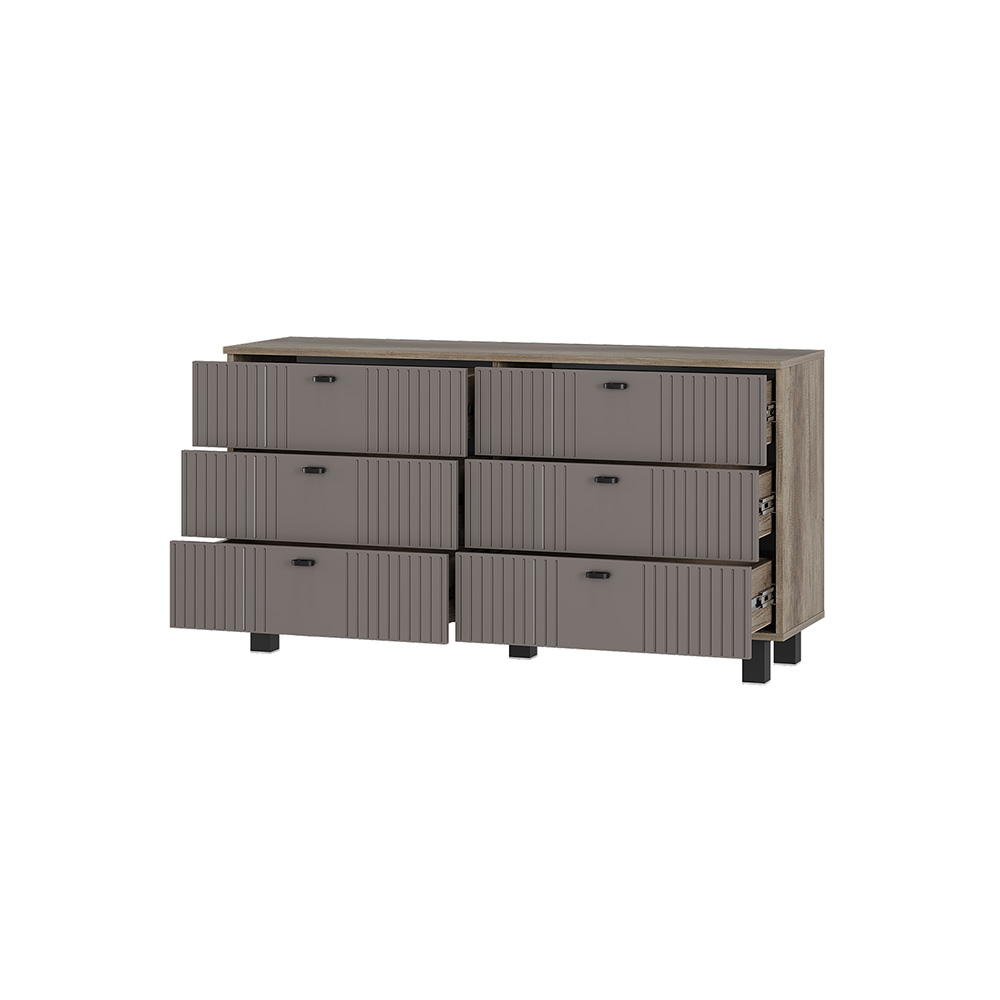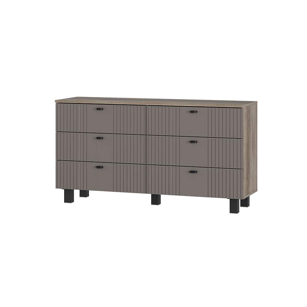 Комод Олива КМ-04 — это элегантное и функциональное решение для любого интерьера. Коллекция представлена в трендовых пудровых оттенках. Фрезеровка на фасадах создает интересные текстурные контрасты и визуальные акценты. Кроме того, этот элемент декора также помогает скрыть мелкие загрязнения, что упрощает уход за мебелью. Черные металлические накладные ручки и петли с доводчиками обеспечивают удобство в использовании.