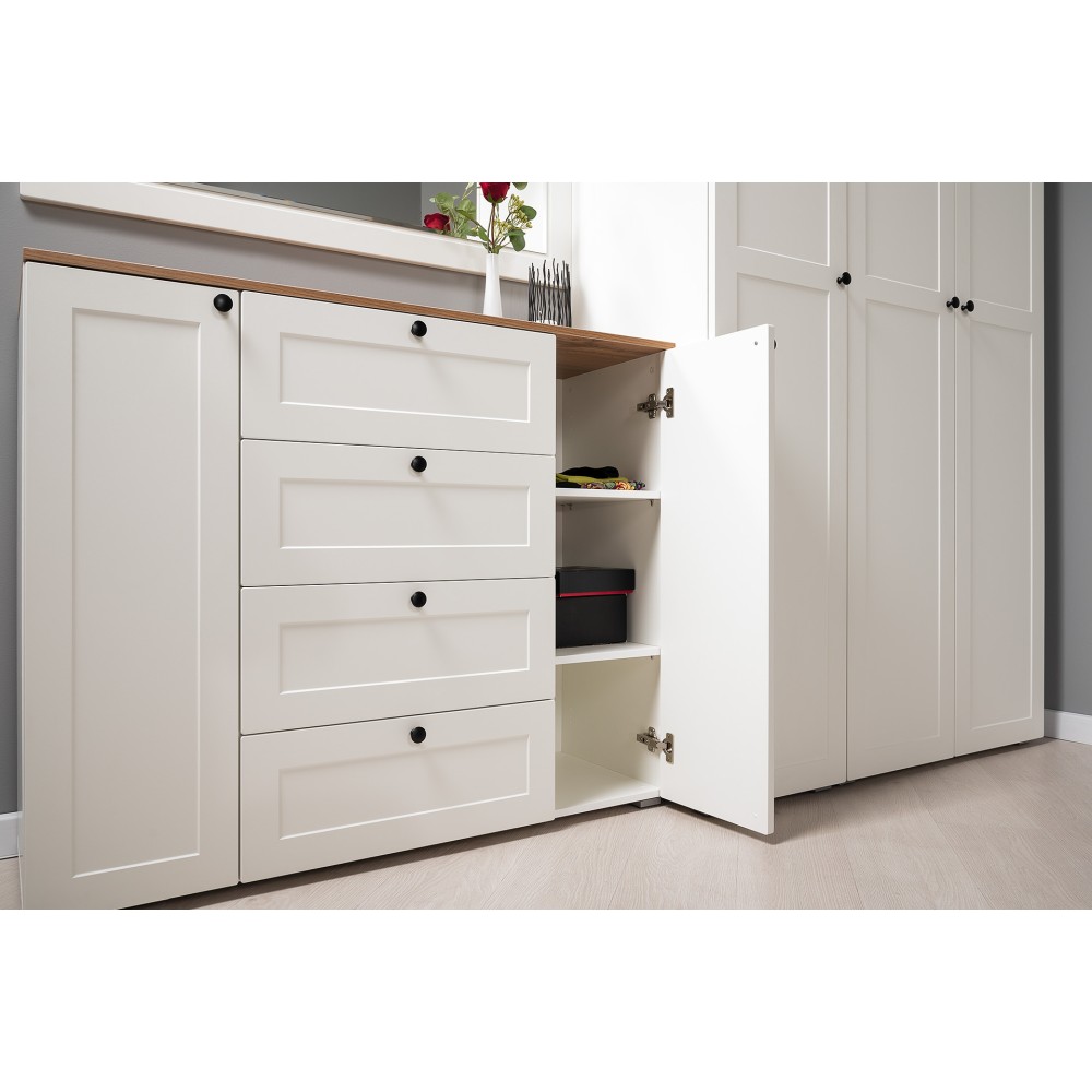 Комод оснащён дверьми, доводчиками, ящиками (4 шт.) ручками из металла. Регулируемые опоры позволяют установить комод на неровной поверхности. Гарантия от производителя составляет 12 месяцев.