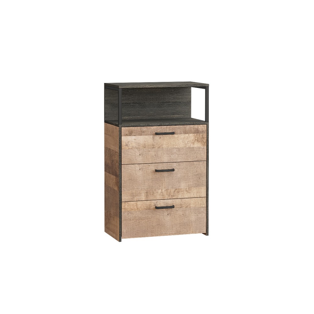 Гостиная "Трувор" выполнена в стиле лофт — идеальное сочетание комфорта, функциональности и эстетики. Металлические стойки с регулируемыми опорами обеспечивают надёжность и долговечность мебели, а лицевая фурнитура с покрытием в тон придаёт мебели аутентичный вид. Петли и направляющие оснащены доводчиками, что обеспечивает плавное закрывание дверей и ящиков. Светодиодная подсветка в витринах с тонированным стеклом эффектно подчёркивает аксессуары, создавая уютную атмосферу.