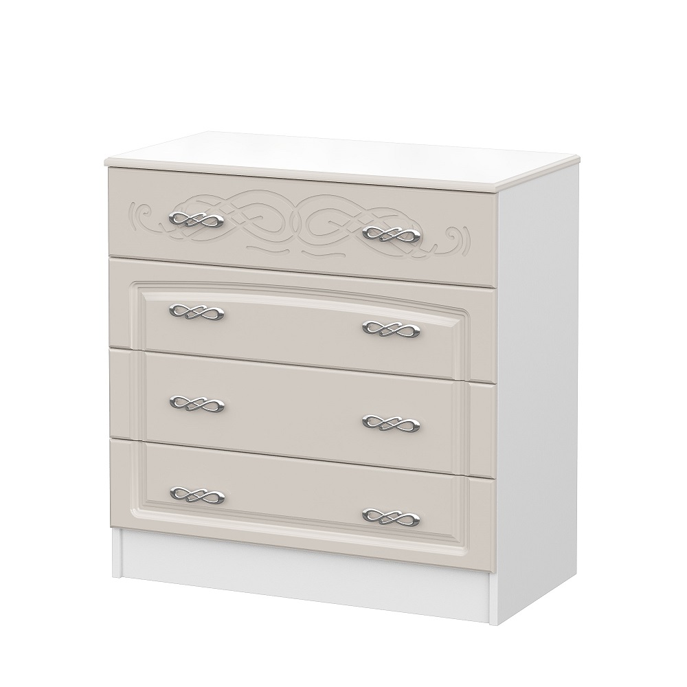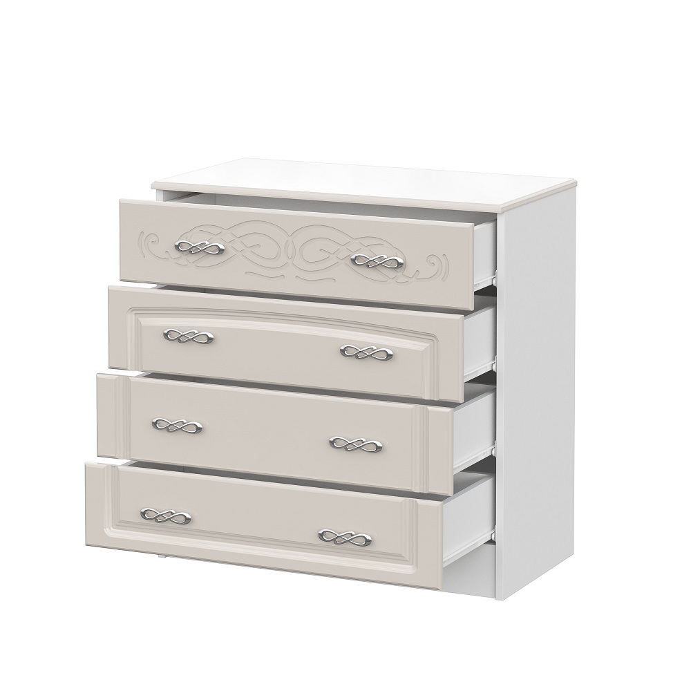 Удобный комод в классическом стиле, который будет гармонично вписываться в интерьер гостиной или спальни. Модуль имеет выкатные ящики на роликовых направляющих. Уточненные ручки выглядят дорого и украшают фрезерованные фасады из МДФ.