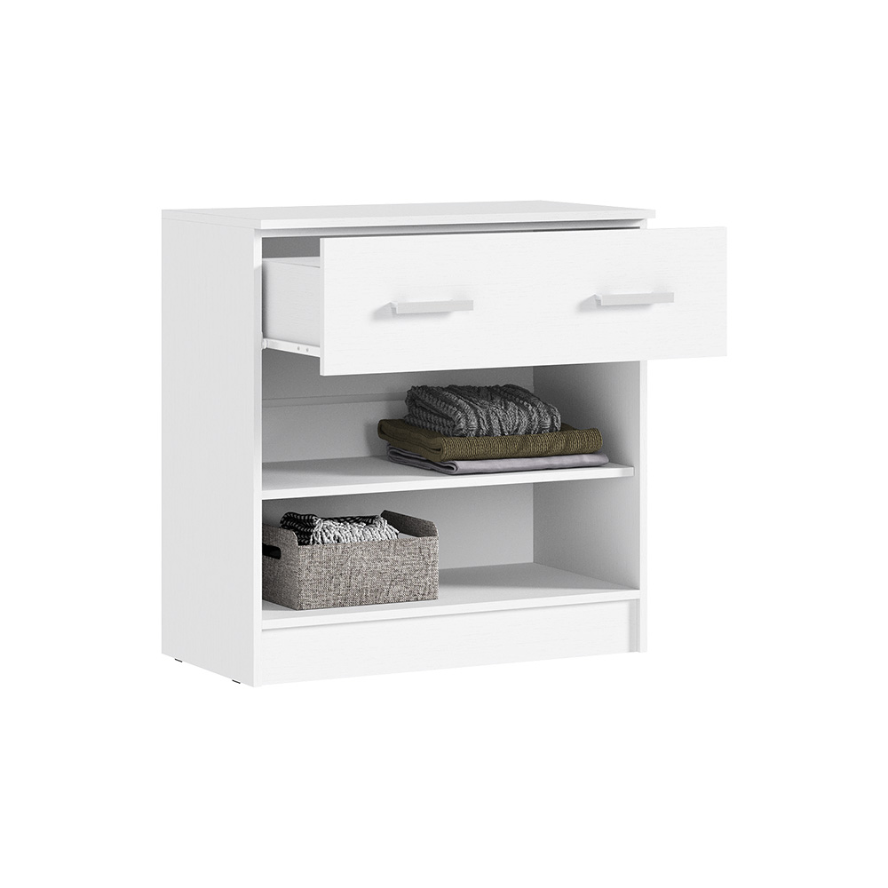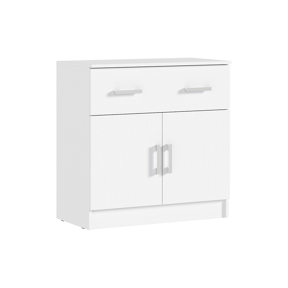 Комод из модульной серии Бася дополнит современный интерьер комнаты. Вместительные ящики и полки за распашными дверьми позволят организовать место хранения белья и одежды, аксессуаров и других нужных предметов.
