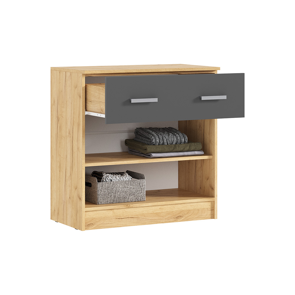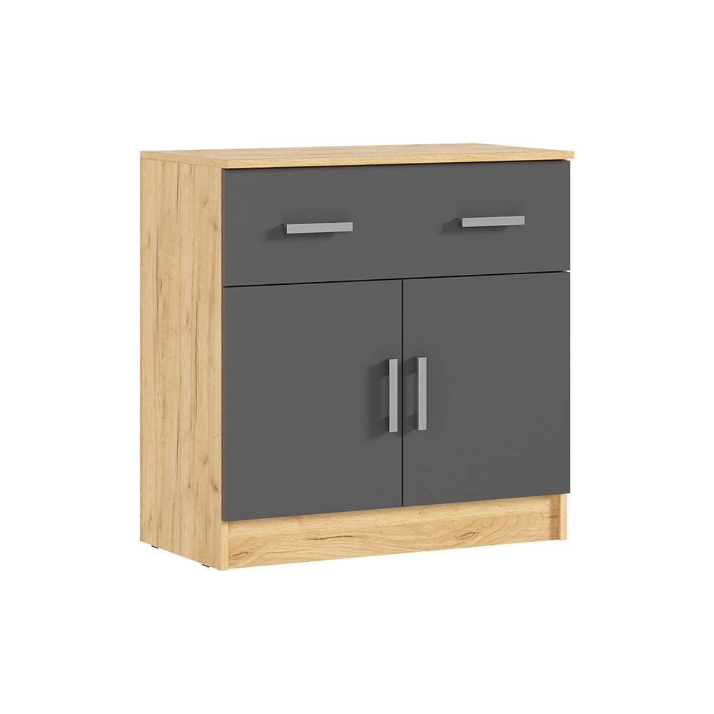 Комод из модульной серии Бася дополнит современный интерьер комнаты. Вместительные ящики и полки за распашными дверьми позволят организовать место хранения белья и одежды, аксессуаров и других нужных предметов.