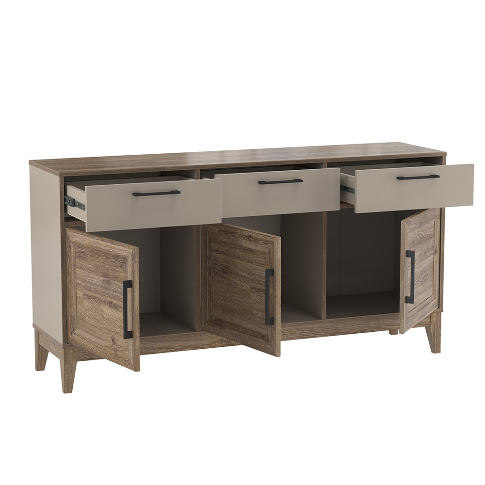 Три ящика полного выдвижения и три отделения за распашными дверцами позволяют грамотно расположить все предметы. Высокие ножки придают комоду ощущение легкости и воздушности. Благодаря своей многофункциональности он может заменить тумбу под телевизор, экономя пространство в вашем доме.