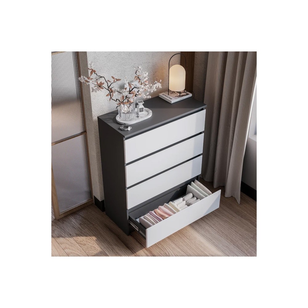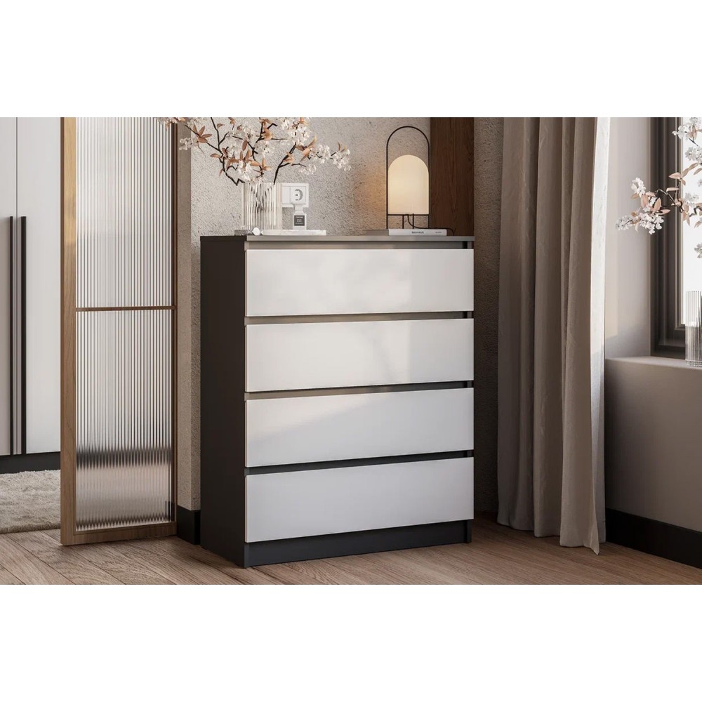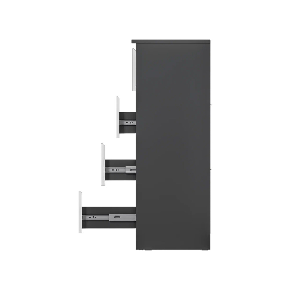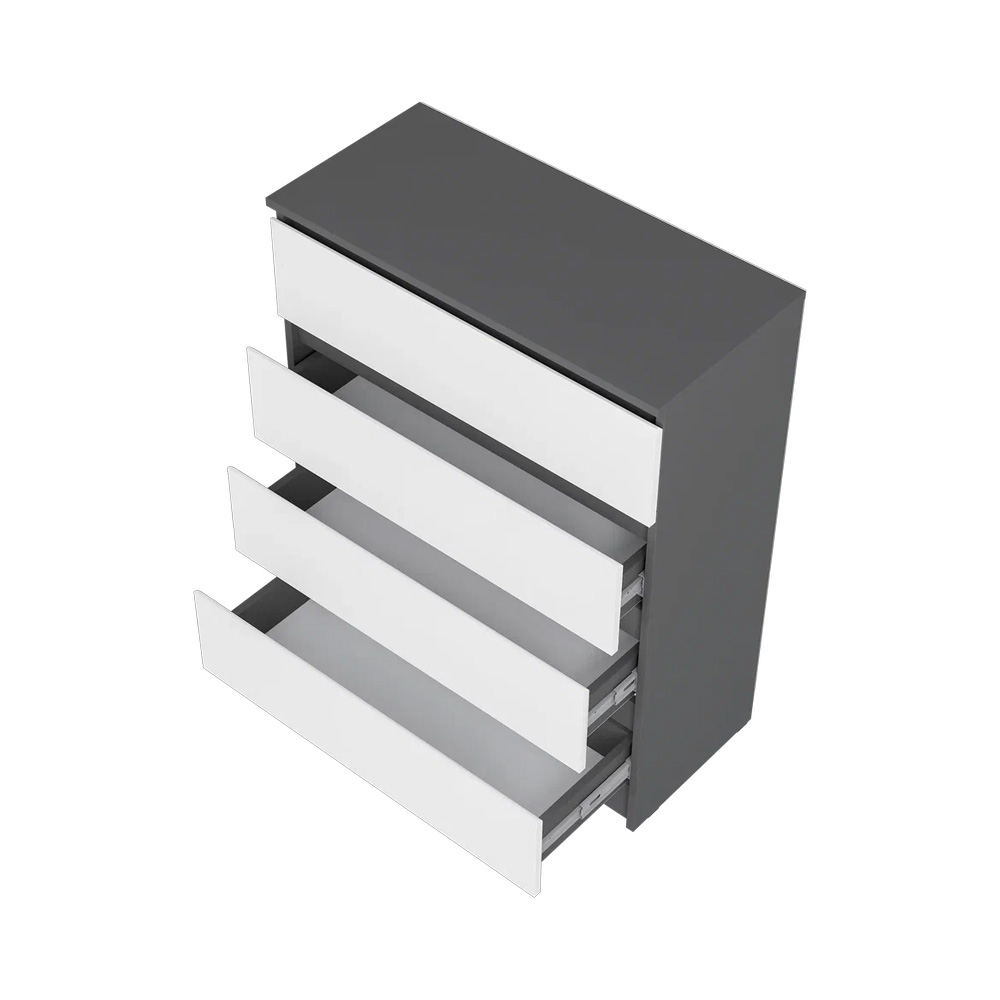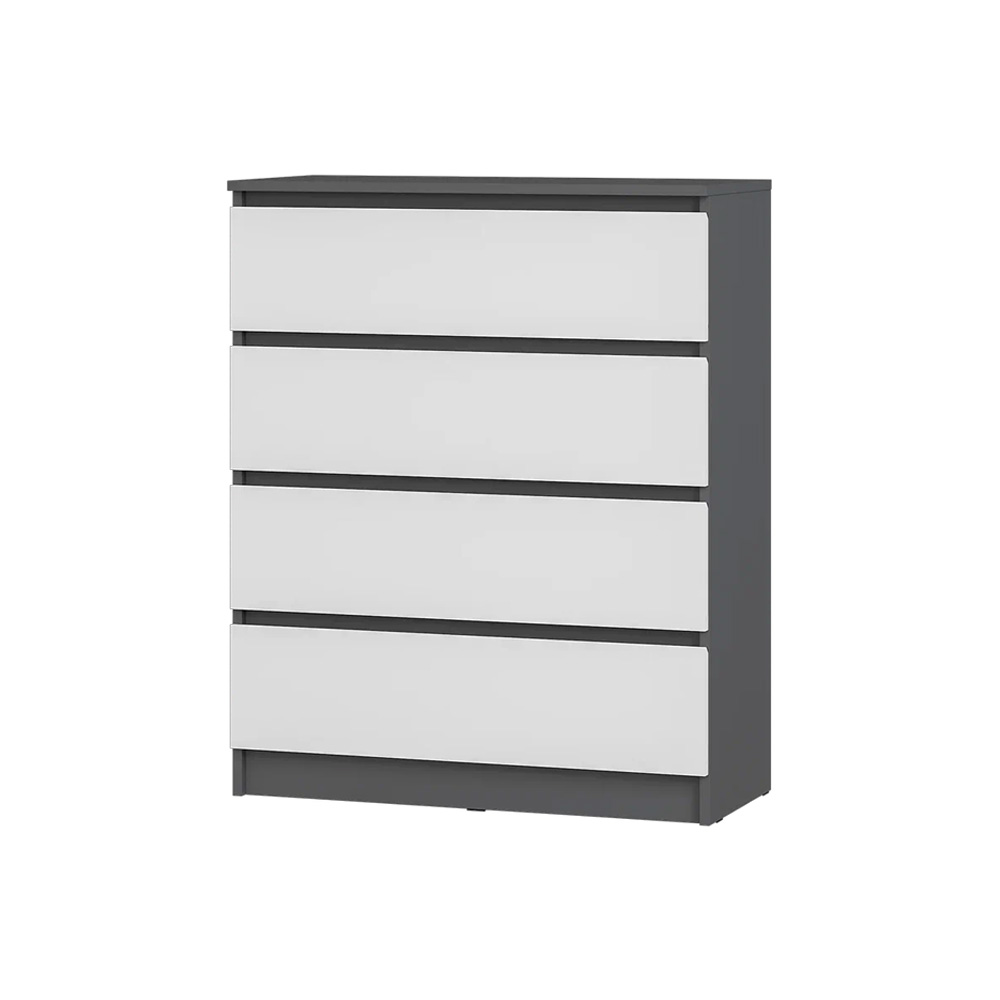 Коллекция "Шарм" - современная классика в контрастном исполнении "белый/графит". Комод воплощает чистый минимализм: гладкие фасады (без фурнитуры) и плавные шариковые направлящие.