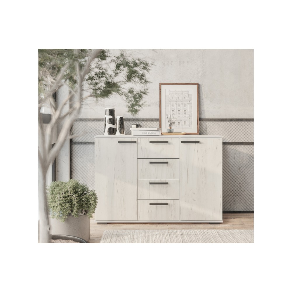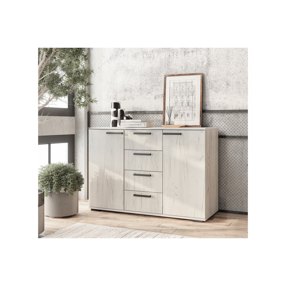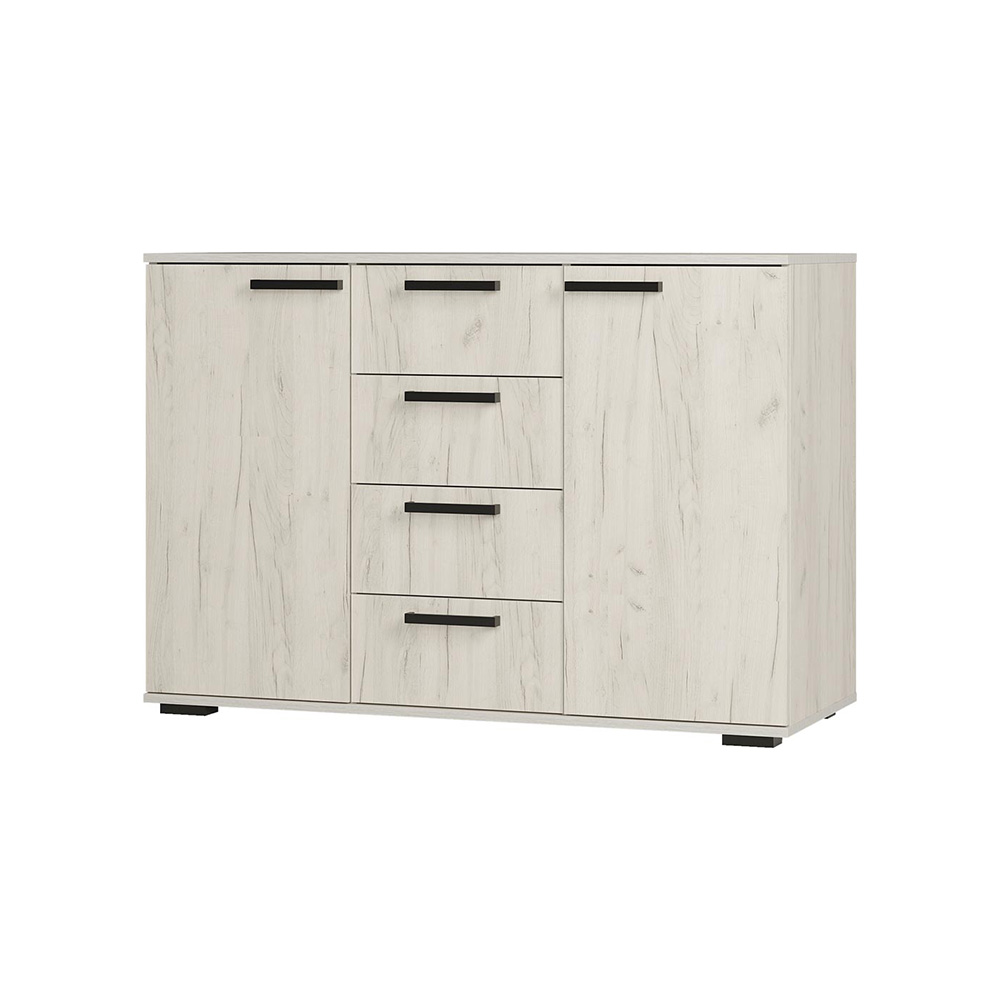 Комод с ящиками из модульной серии Стандарт №2 дополнит современный интерьер комнаты. Четыре вместительных ящика и полки за распашными дверьми позволят организовать место хранения белья и одежды, аксессуаров и других нужных предметов.