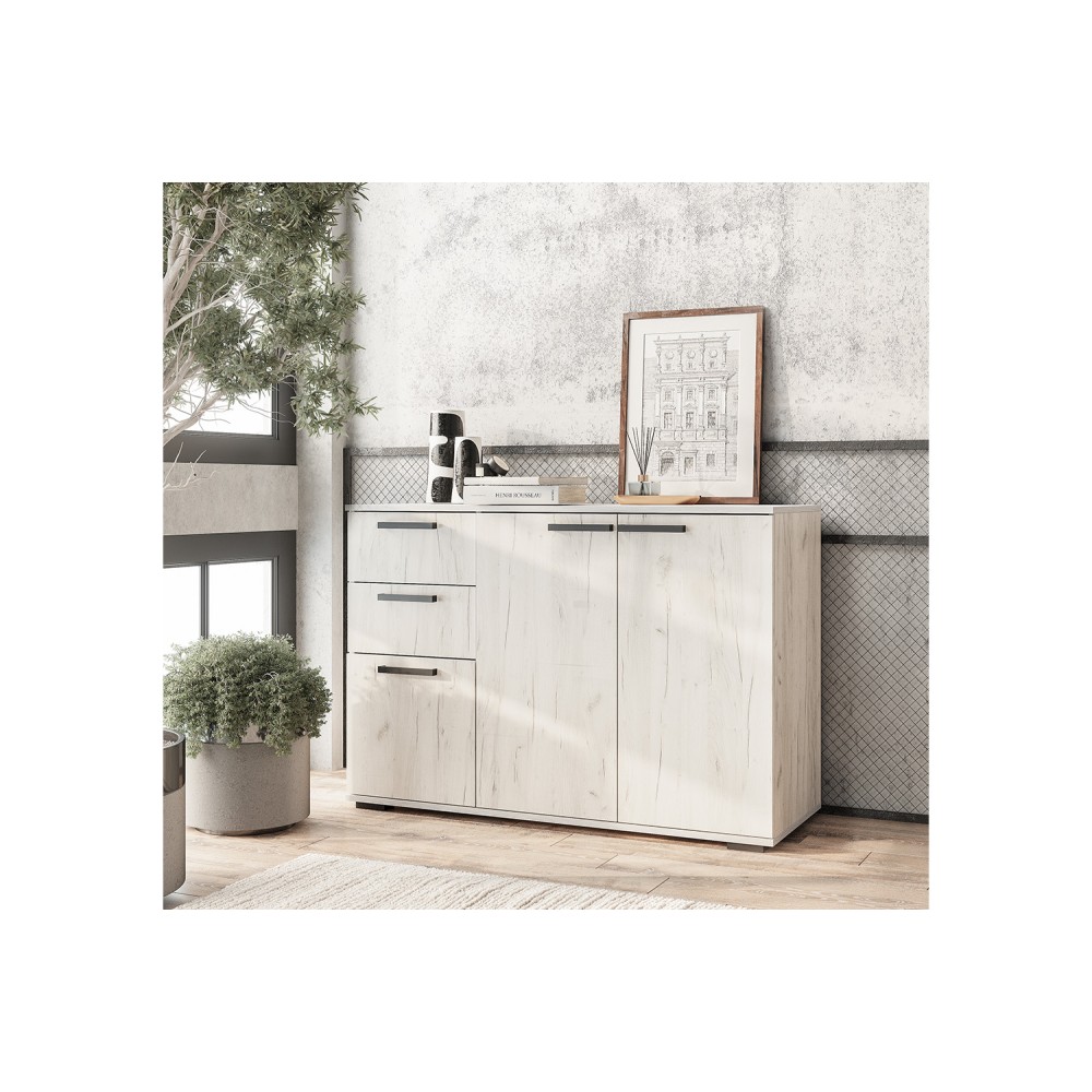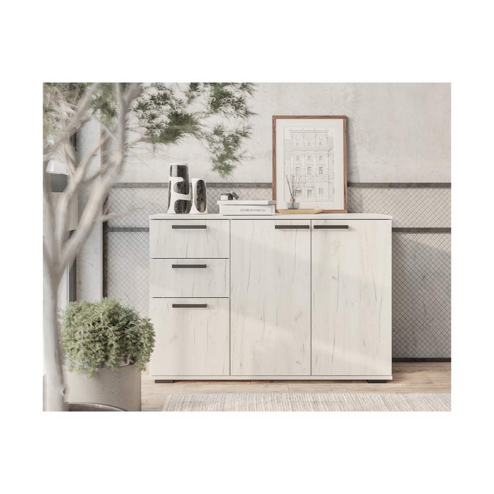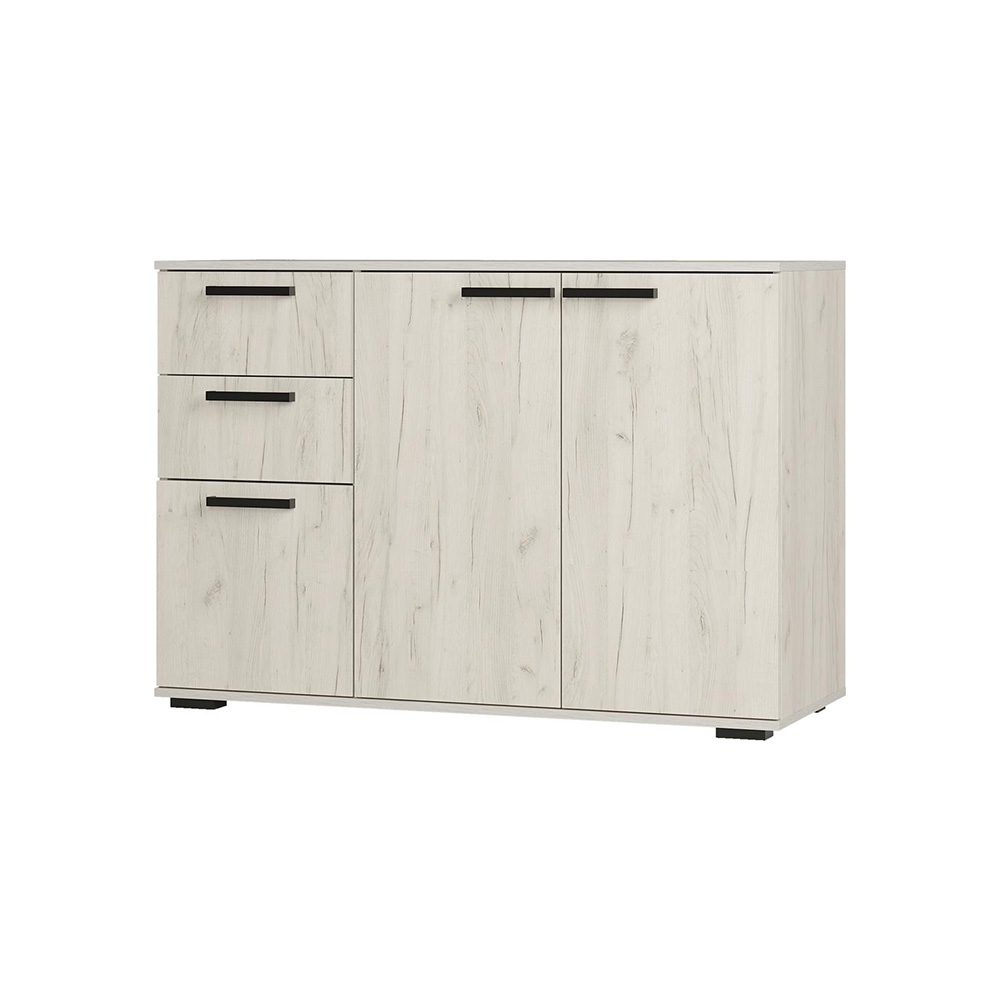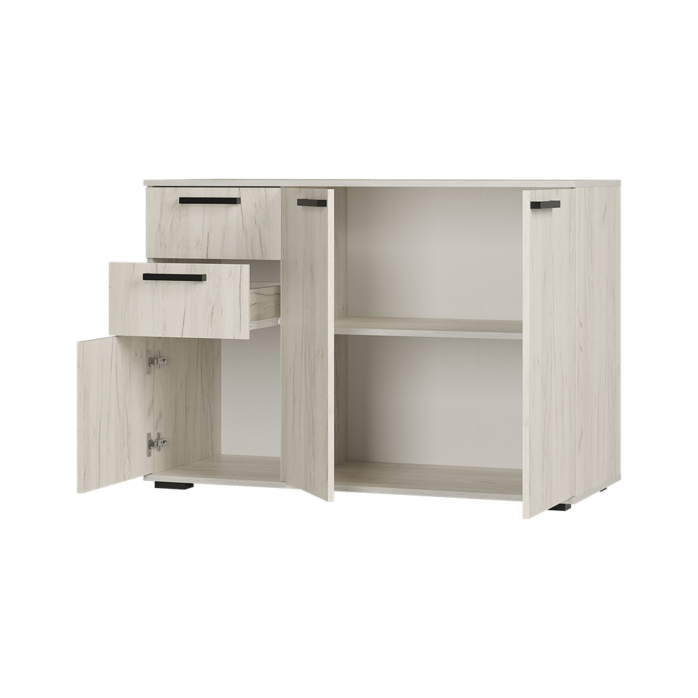 Комод с ящиками из модульной серии Стандарт №3 дополнит современный интерьер комнаты. Вместительные ящики и полки за распашными дверьми позволят организовать место хранения белья и одежды, аксессуаров и других нужных предметов.