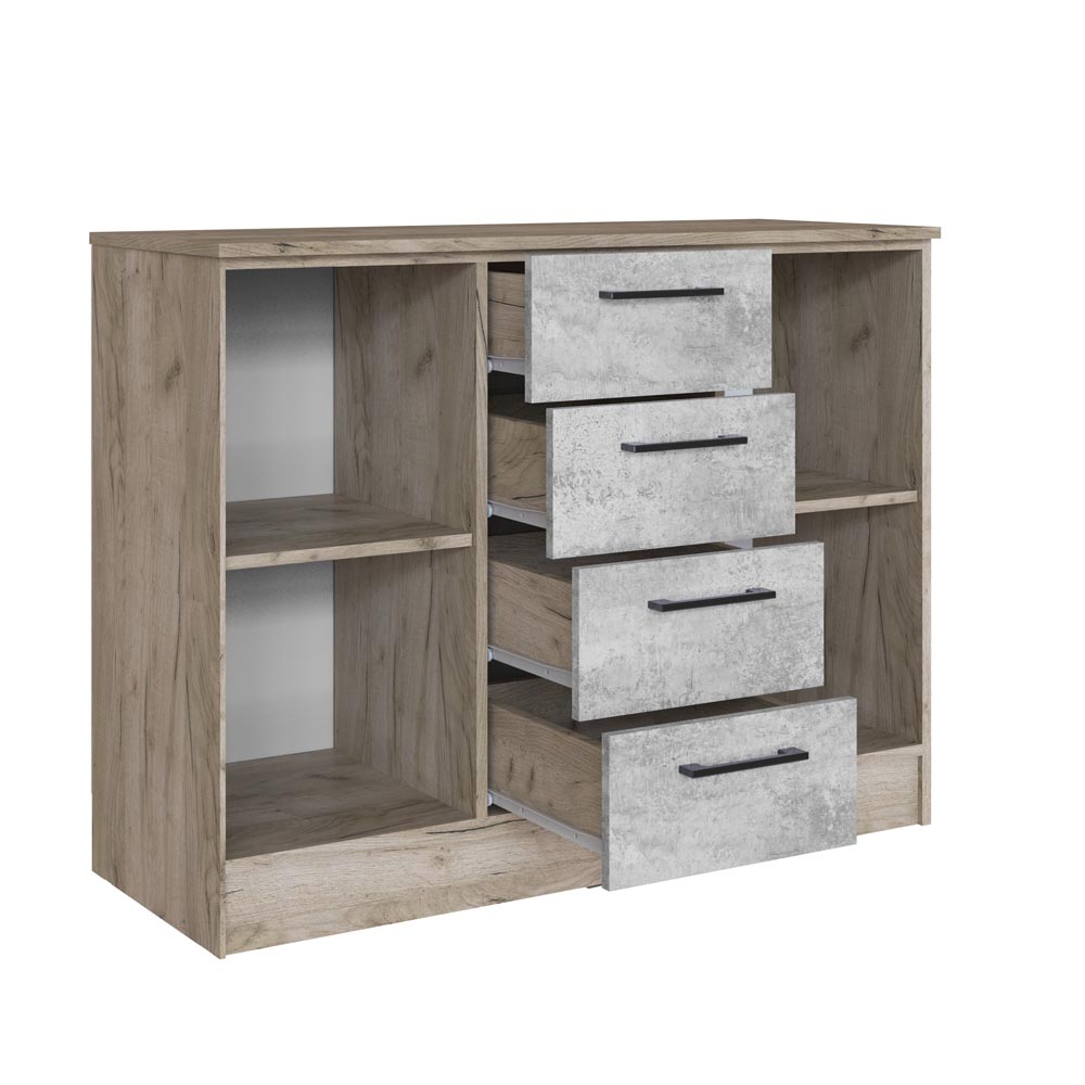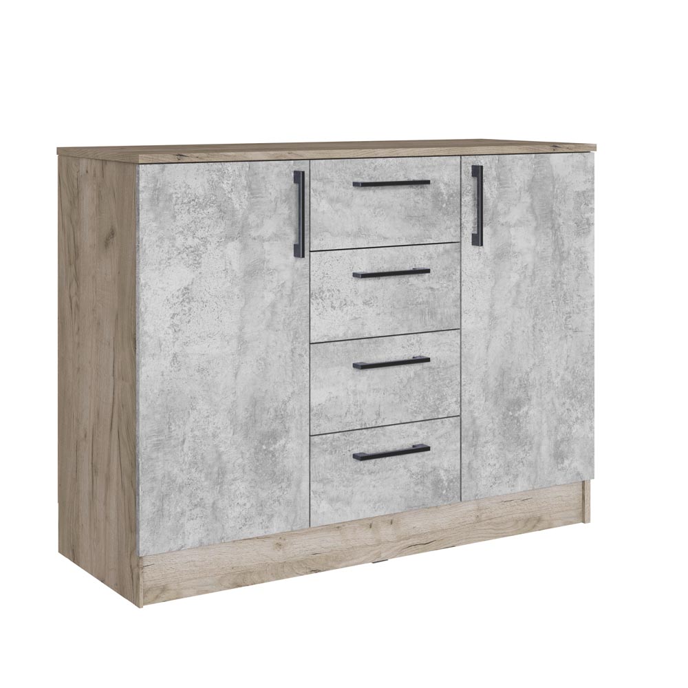 Комод с ящиками из модульной серии Вегас дополнит современный интерьер комнаты. Четыре вместительных ящика и полки за распашными дверьми позволят организовать место хранения белья и одежды, аксессуаров и других нужных предметов.