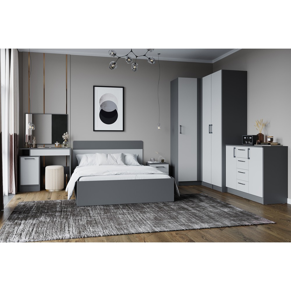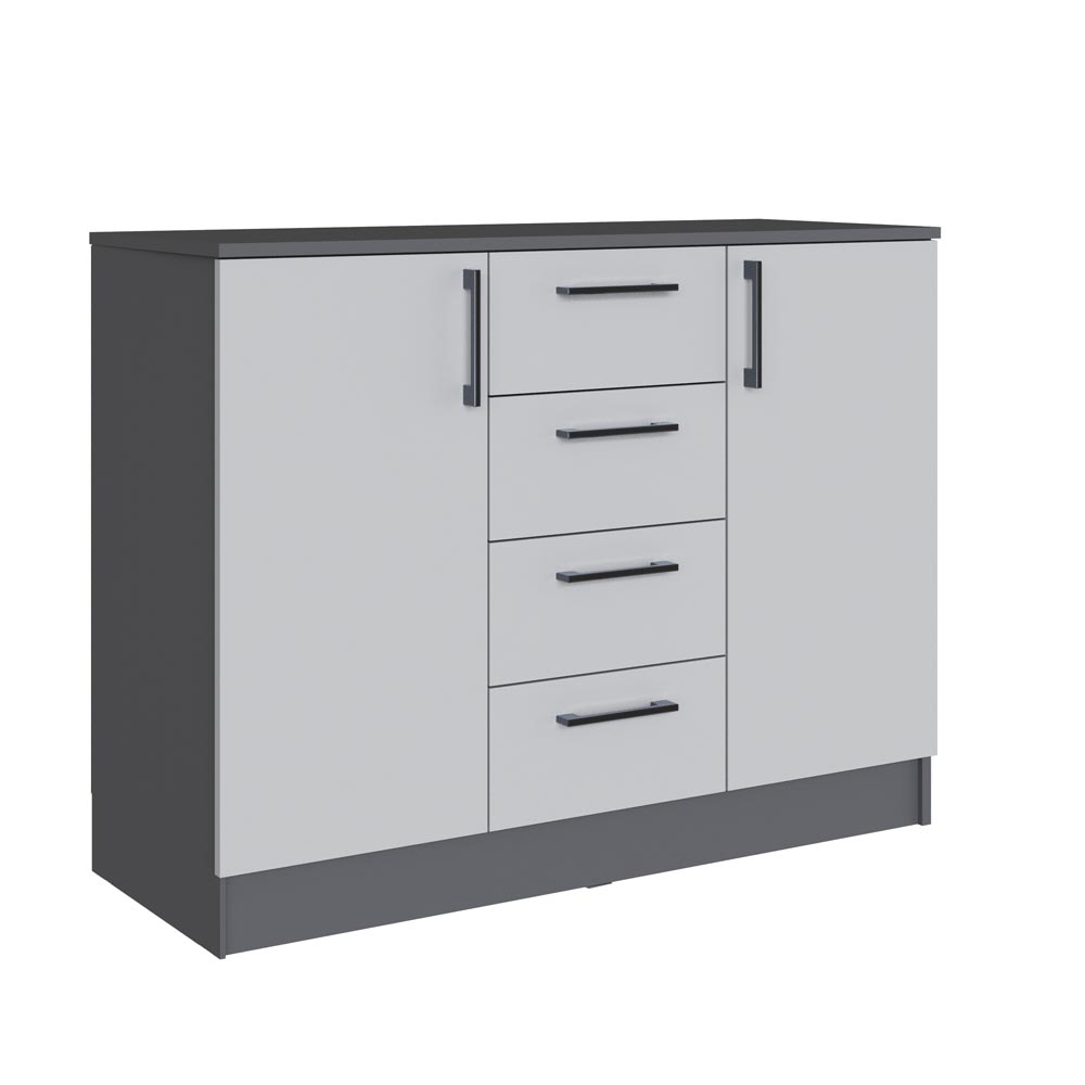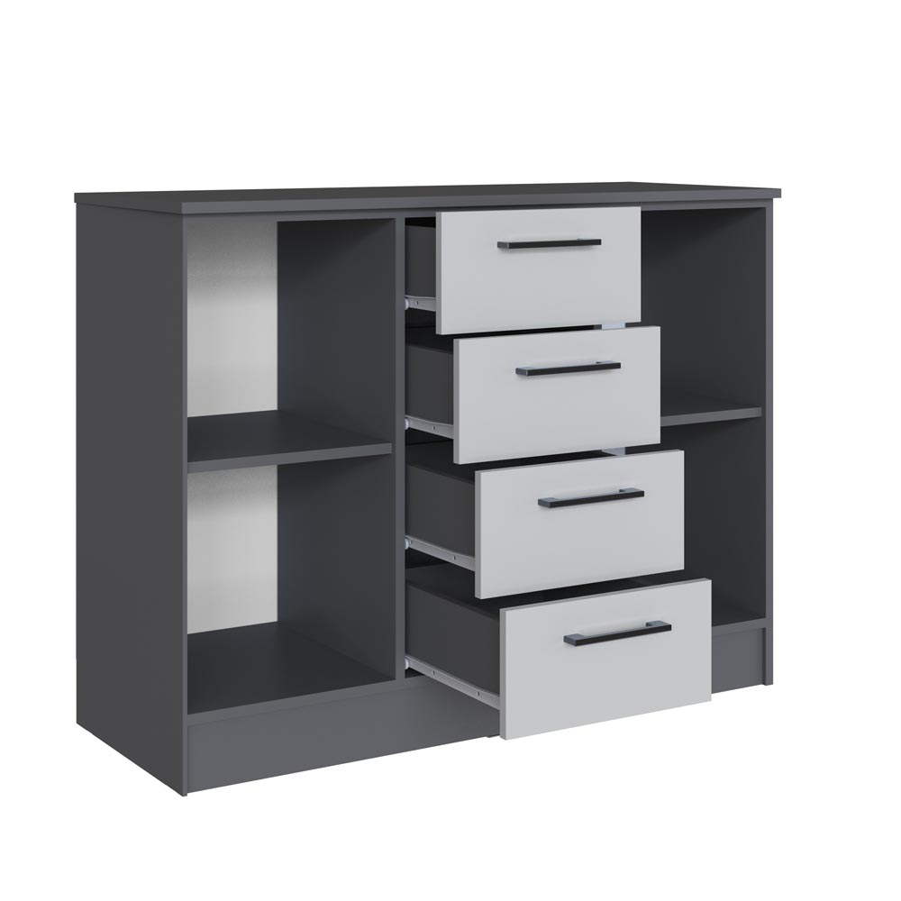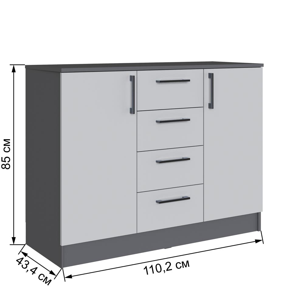 Комод с ящиками из модульной серии Вегас дополнит современный интерьер комнаты. Четыре вместительных ящика и полки за распашными дверьми позволят организовать место хранения белья и одежды, аксессуаров и других нужных предметов.