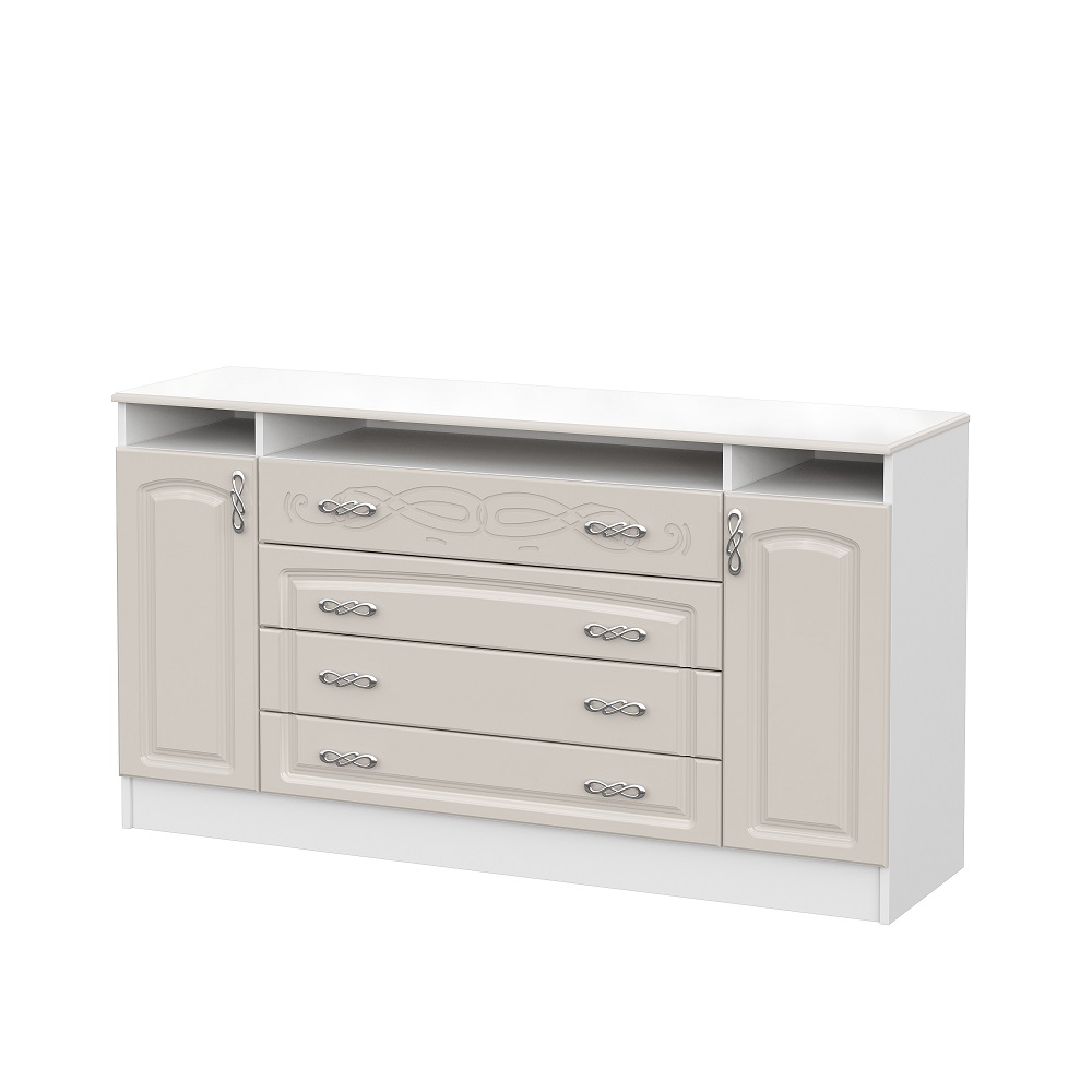 Широкий комод в классическом стиле, который будет гармонично вписываться в интерьер гостиной или спальни. Модуль имеет выкатные ящики, закрытые полки за фасадами, а также открытые полки под столешницей. Уточненные ручки выглядят дорого и украшают фрезерованные фасады из МДФ.