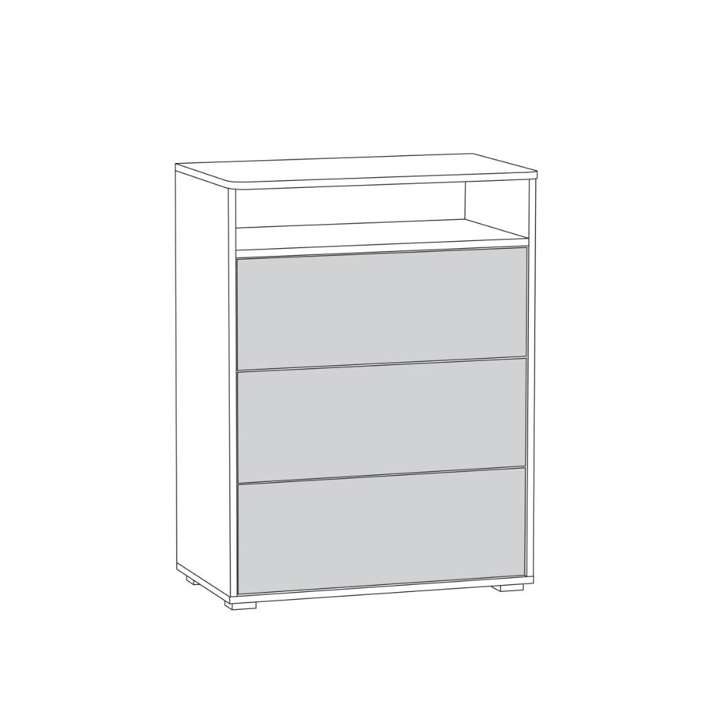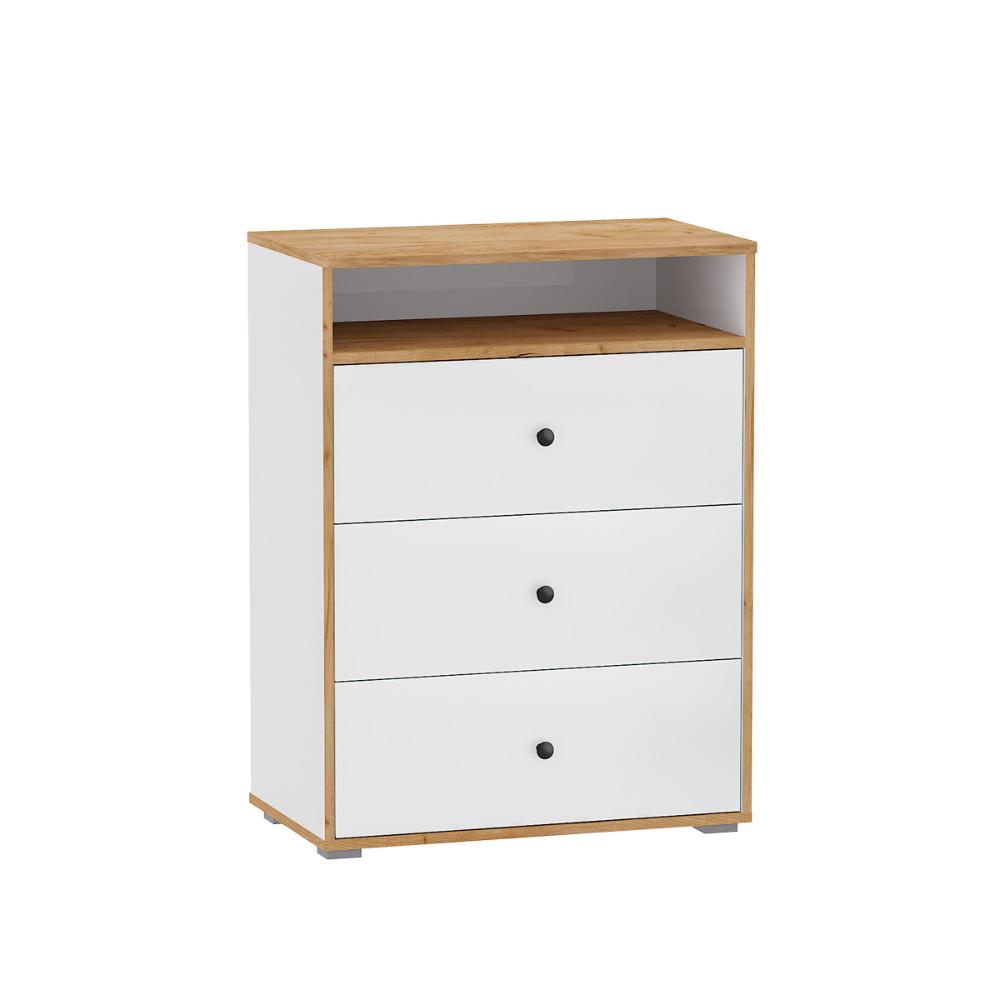 Комод включает верхнюю открытую полку и три вместительных выдвижных ящика, которые прекрасно подойдут для хранения одежды, аксессуаров, книг, документов и других предметов. Изготовленный из высококачественных материалов, он обеспечивает надёжность и долговечность эксплуатации.