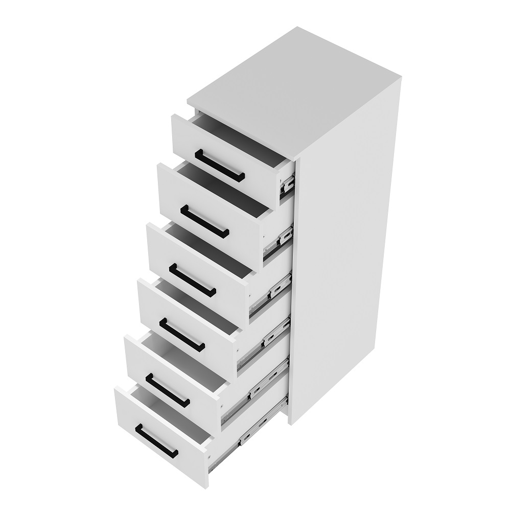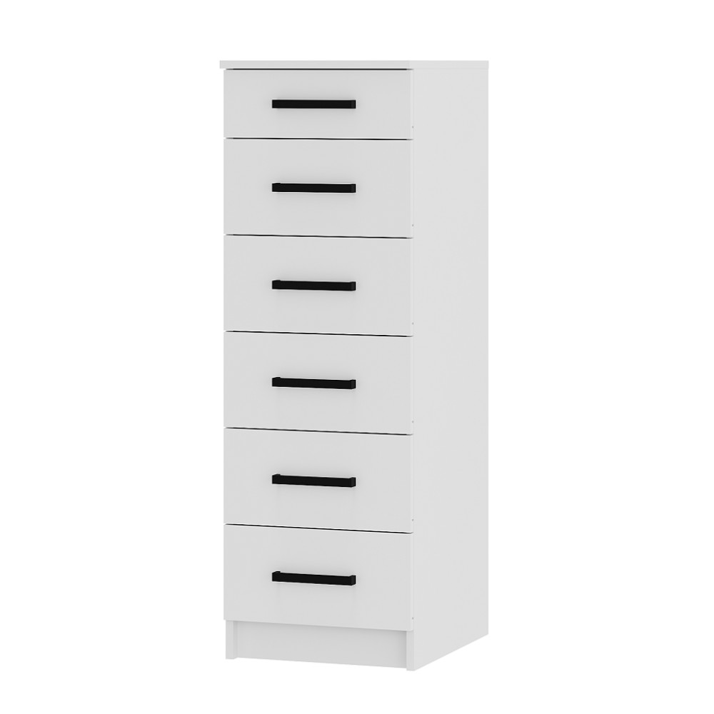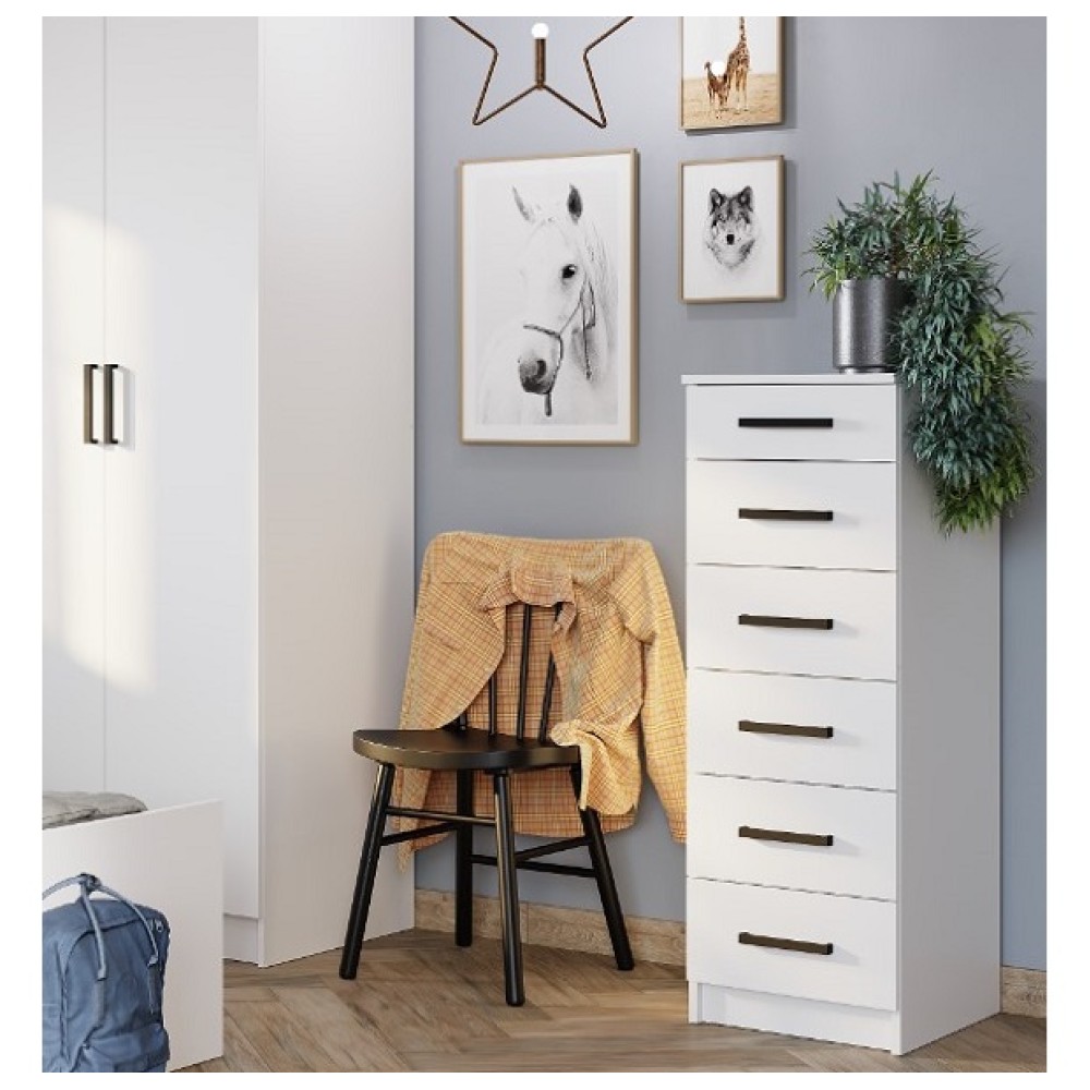 Коллекция мебели для спальни Фьюжн является воплощением эстетики минимализма. Белый цвет в сочетании с черной фурнитурой, строгие линии, простой конструктив – все это лучшие черты мебельного дизайна. Высокий комод с 6-тью ящиками на направляющих плавного выдвижения поможет организовать хранение вещей в сложенном виде, аксессуаров, книг.