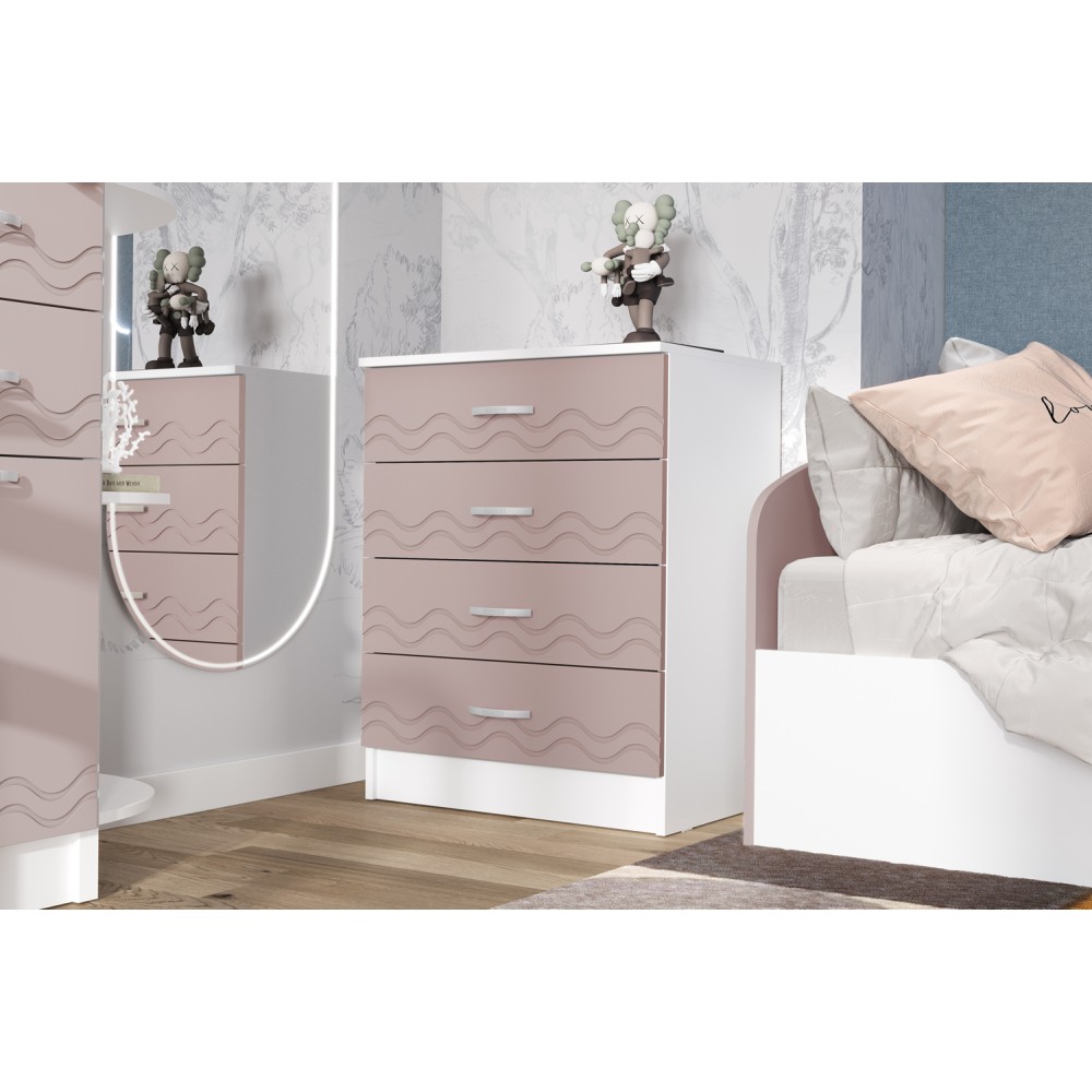 Комод с ящиками из модульной серии Юниор дополнит современный интерьер комнаты. Вместительные ящики и полки за распашными дверьми позволят организовать место хранения белья и одежды, аксессуаров и других нужных предметов.
