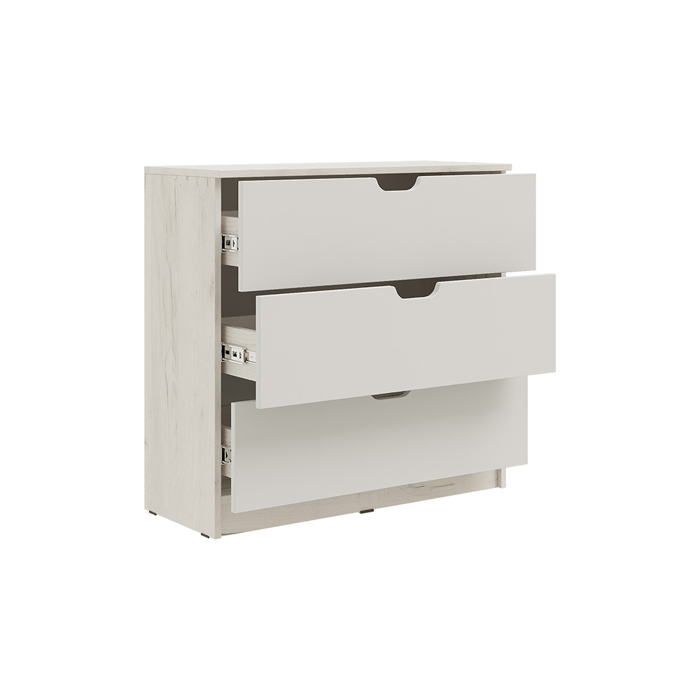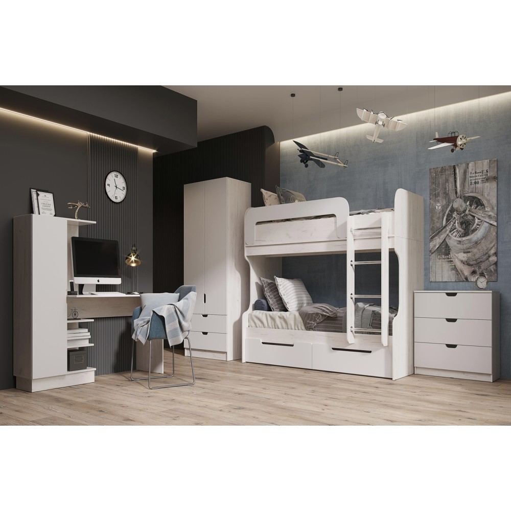 Комод с ящиками из модульной серии Юниор дополнит современный интерьер комнаты. Вместительные ящики позволят организовать место хранения белья и одежды, аксессуаров и других нужных предметов.