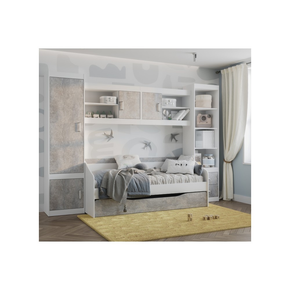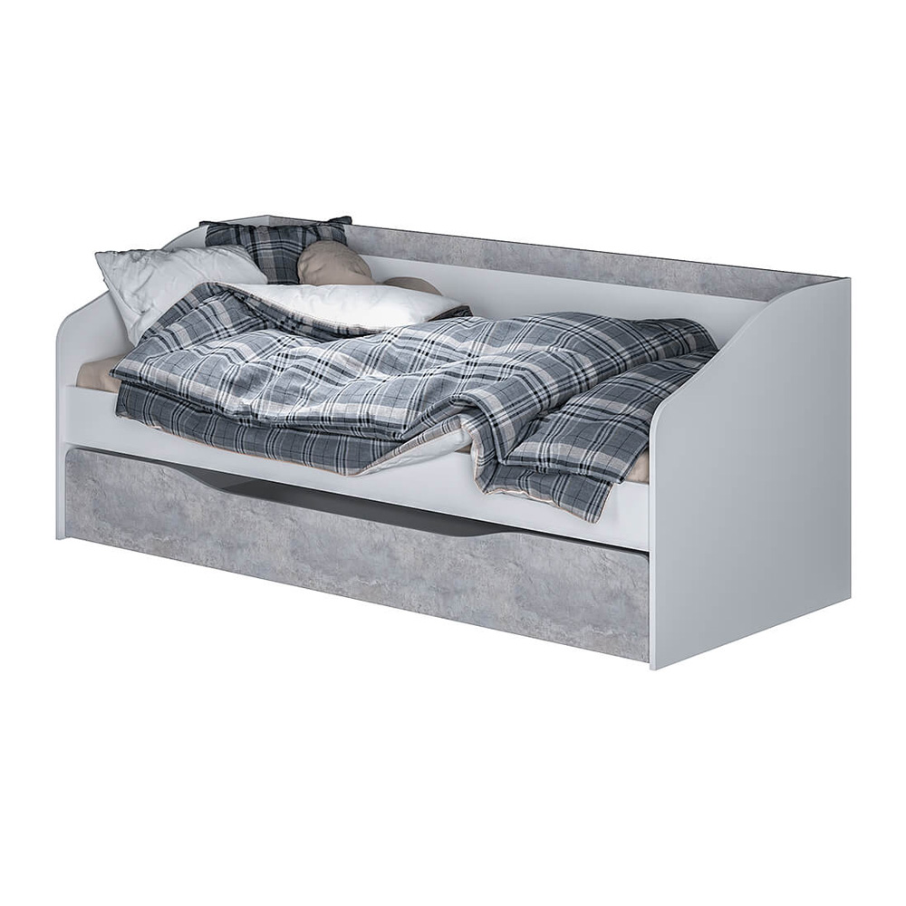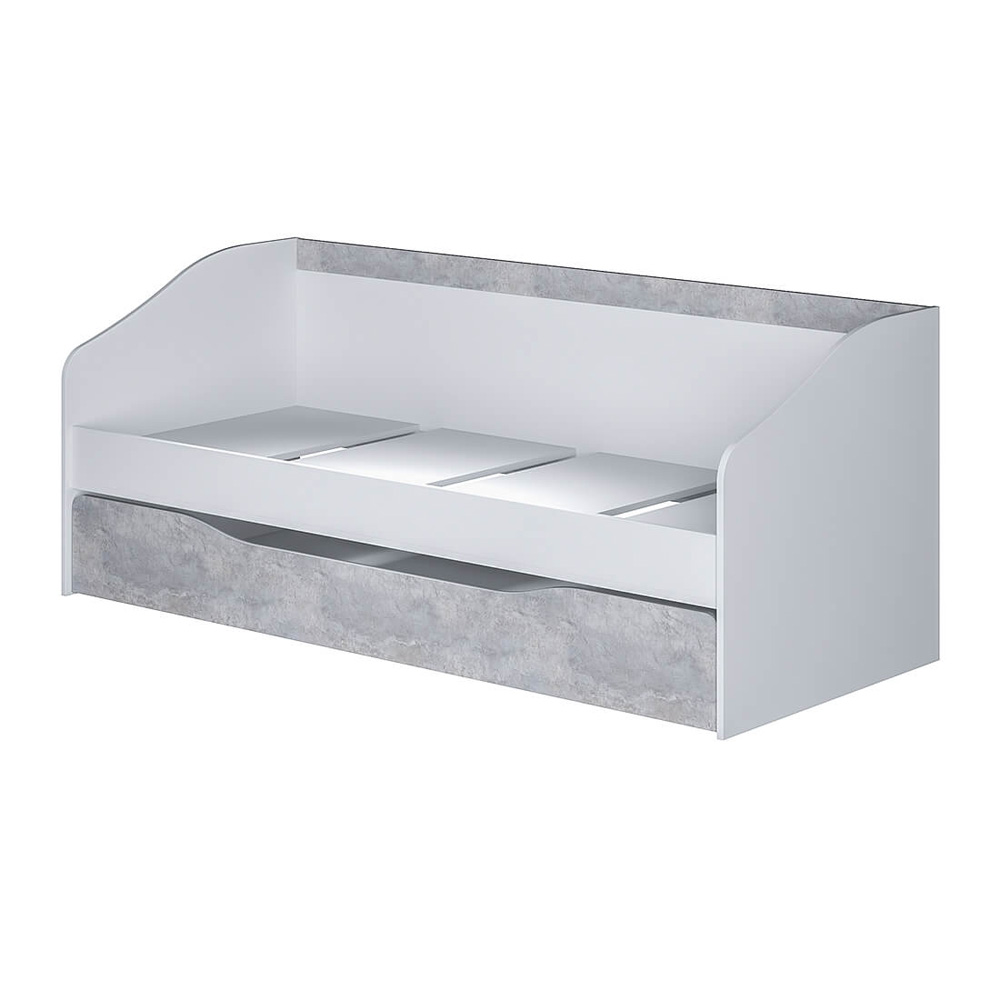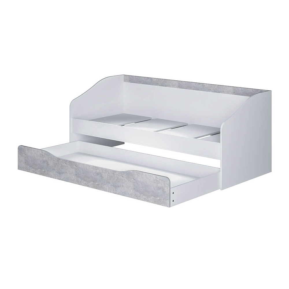 Детская кровать Паскаль выполнена из ЛДСП в комбинации двух цветов белый и цемент светлый: большой выдвижной ящик станет отличным местом хранения для необходимых вещей или игрушек.