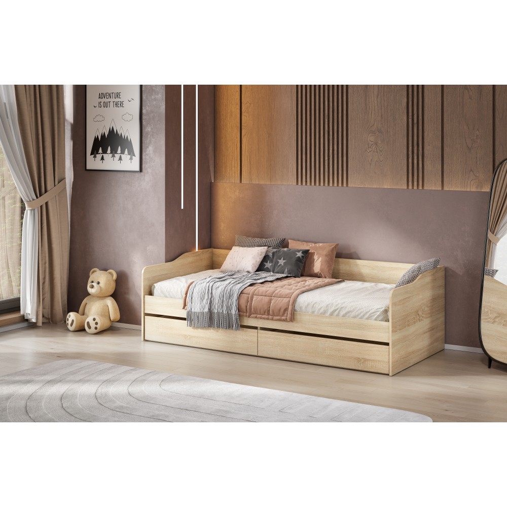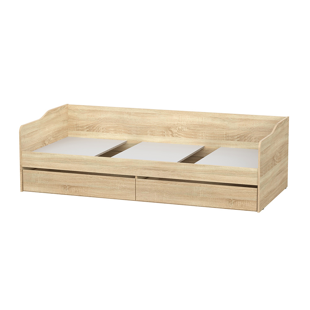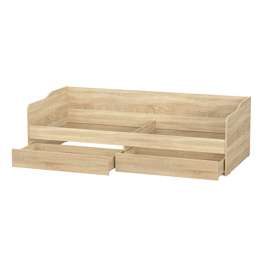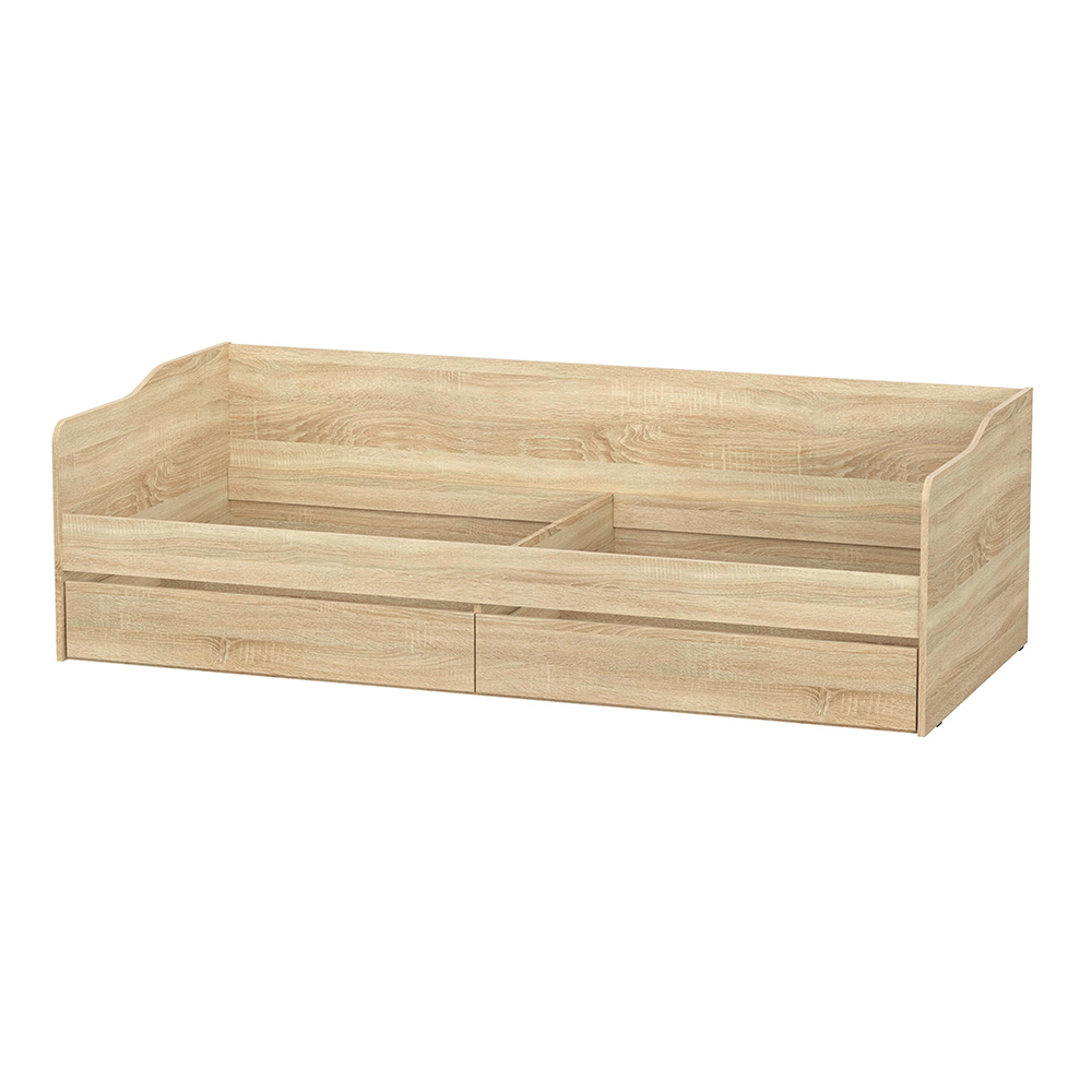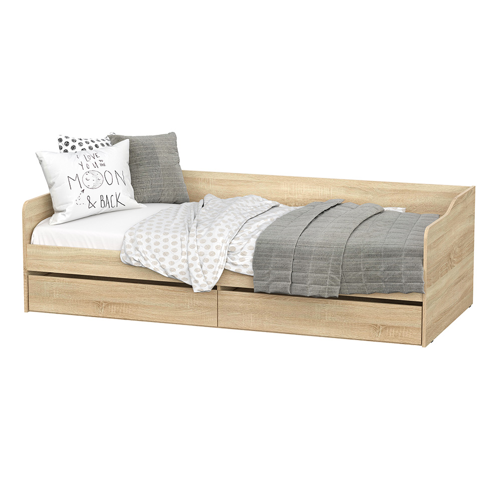 Надежная односпальная кровать из ЛДСП с ящиками. Выполнена в приятном древесном декоре "дуб сонома". Два выкатных ящика подойдут для хранения постельного белья и личных вещей ребенка.
