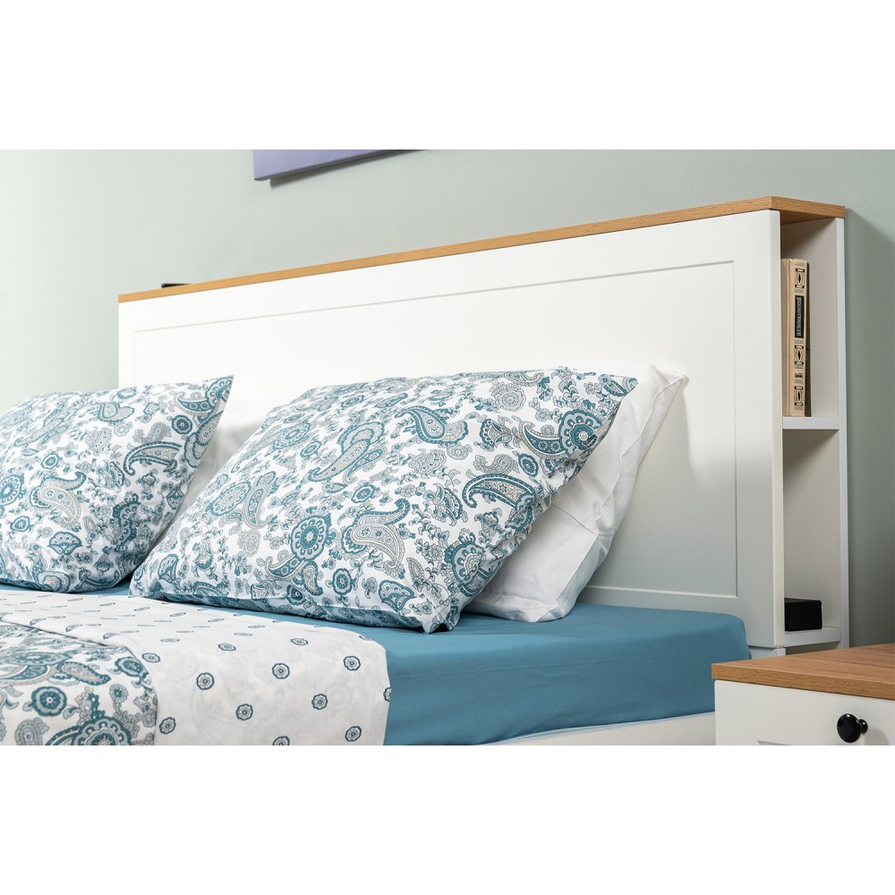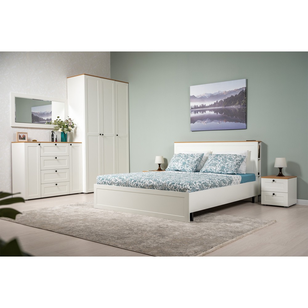 В изголовье кровати предусмотрены вместительные ниши. Шкафная группа полноценной глубины позволяет эффективно организовать систему хранения.
