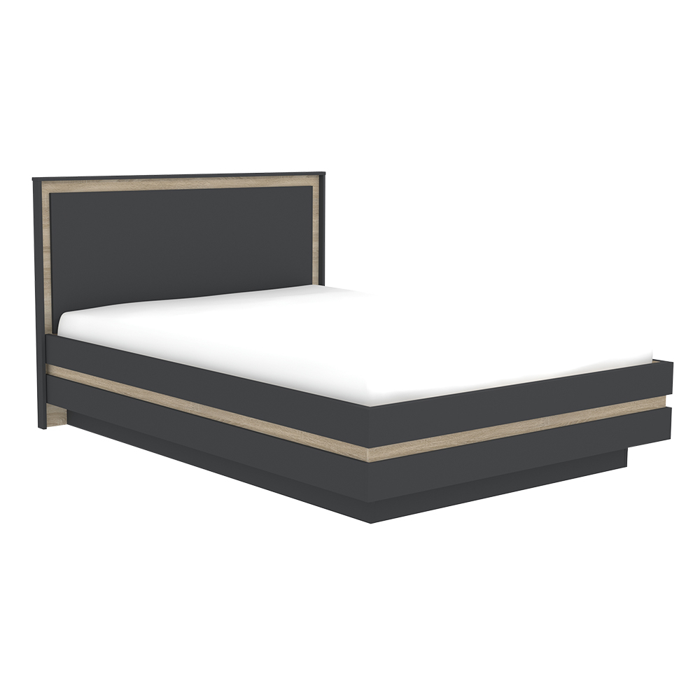 Двуспальная кровать из серии Анона в эффектном цвете антрацит с декоративными вставками дуб сонома по основанию и на изголовье как будто парит над поверхностью пола.