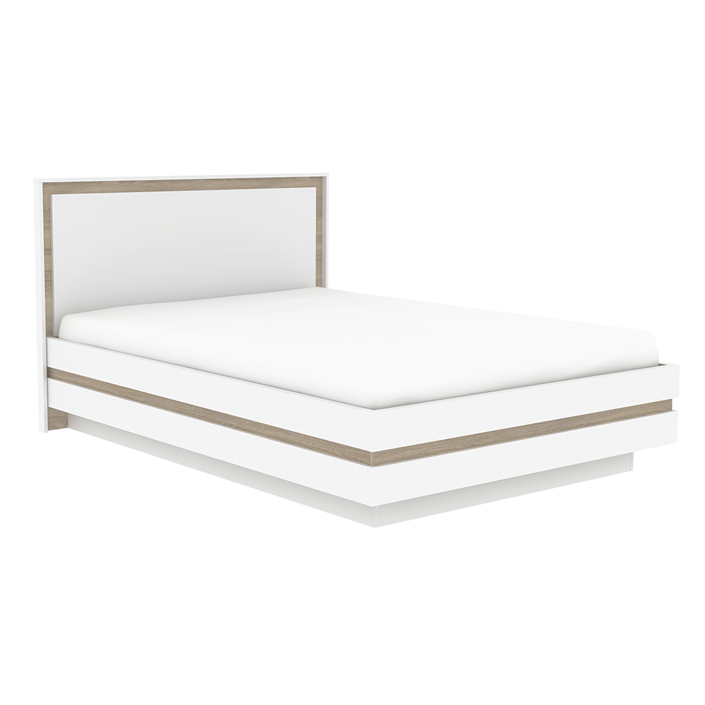 Двуспальная белоснежная кровать из серии Анона с декоративными вставками дуб сонома по основанию и на изголовье.