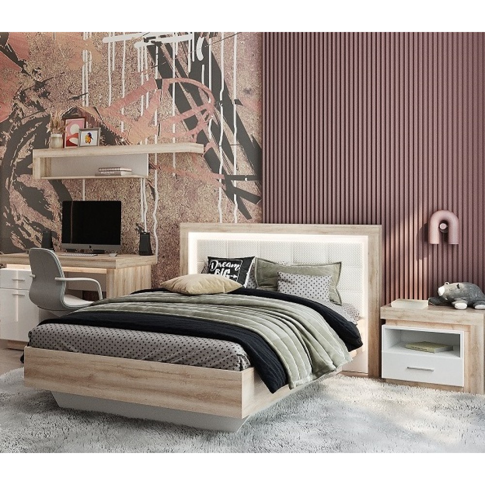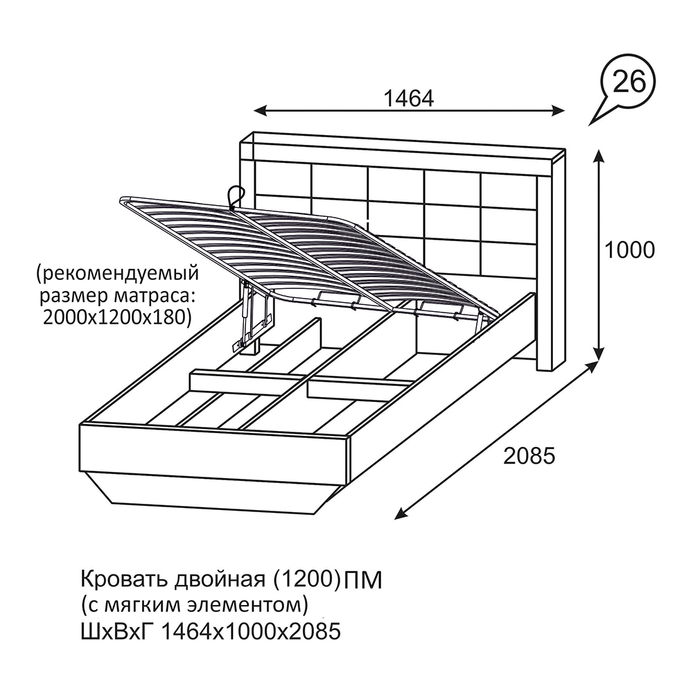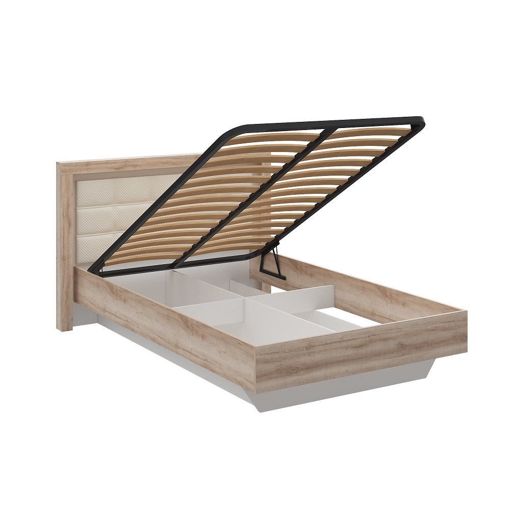 Полутороспальная кровать с подъемным механизмом и спальным местом размером 120х200. Изголовье кровати декорировано мягкой вставкой из экокожи «белый пунто». Нишу под основанием Вы можете использовать для хранения постельного белья и личных вещей, которые нужно спрятать от лишних глаз.