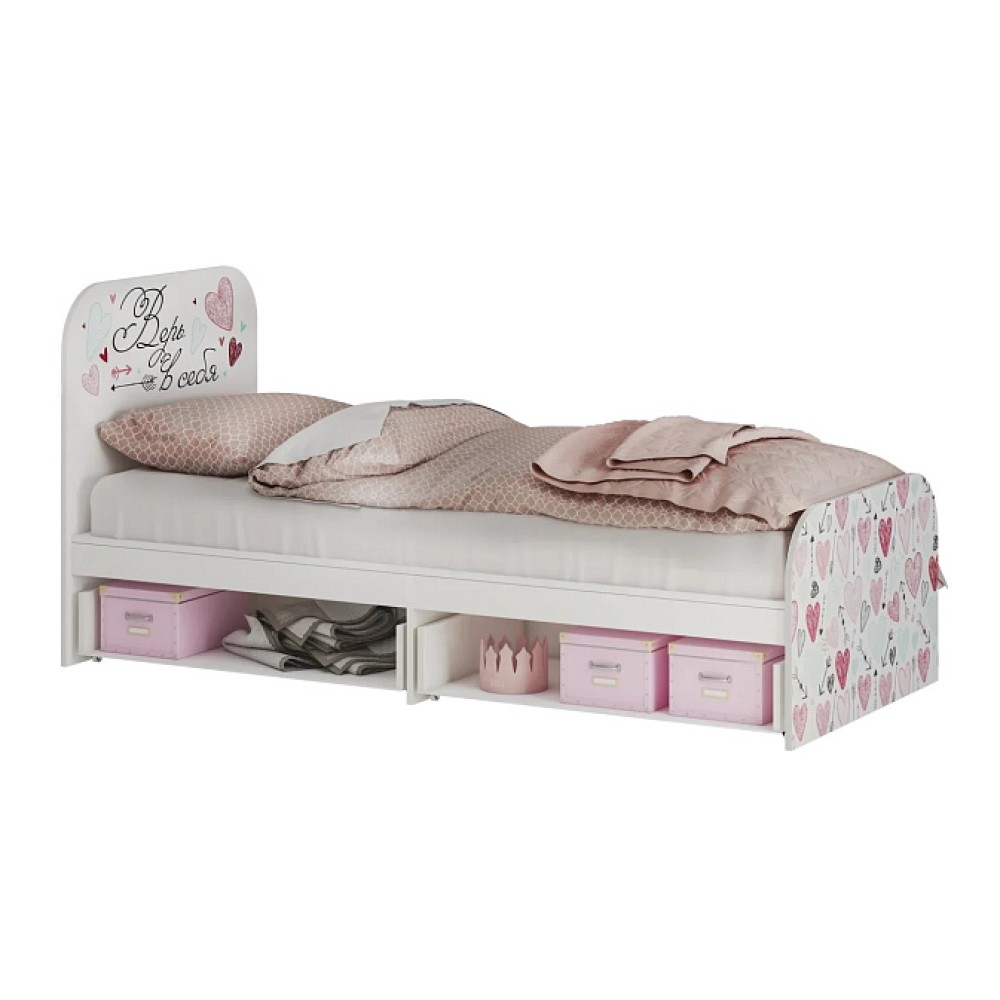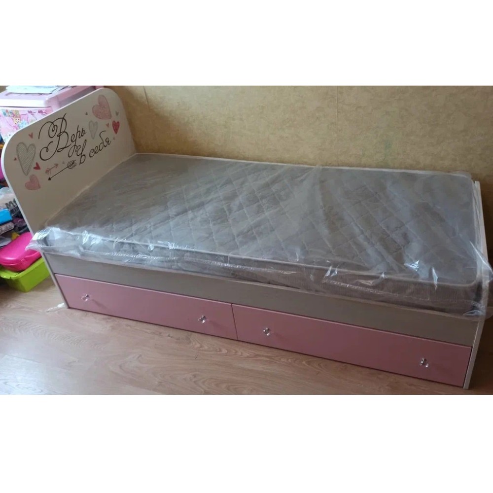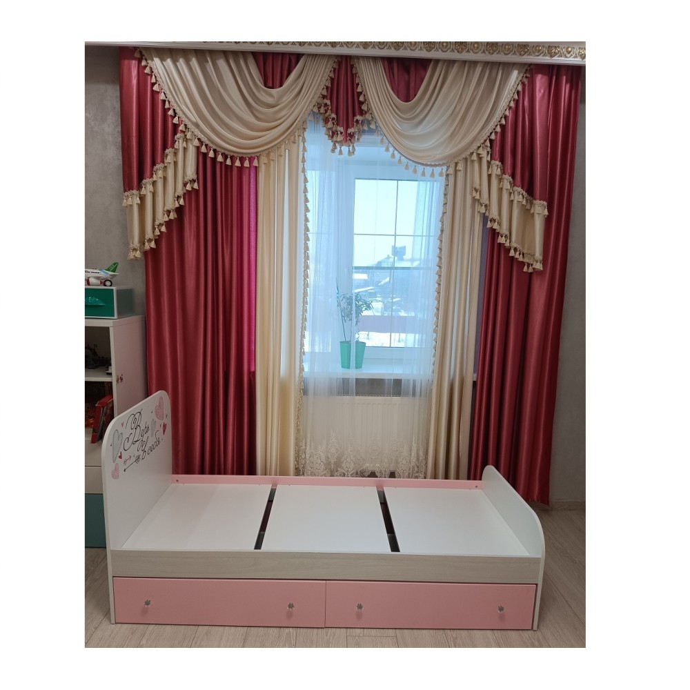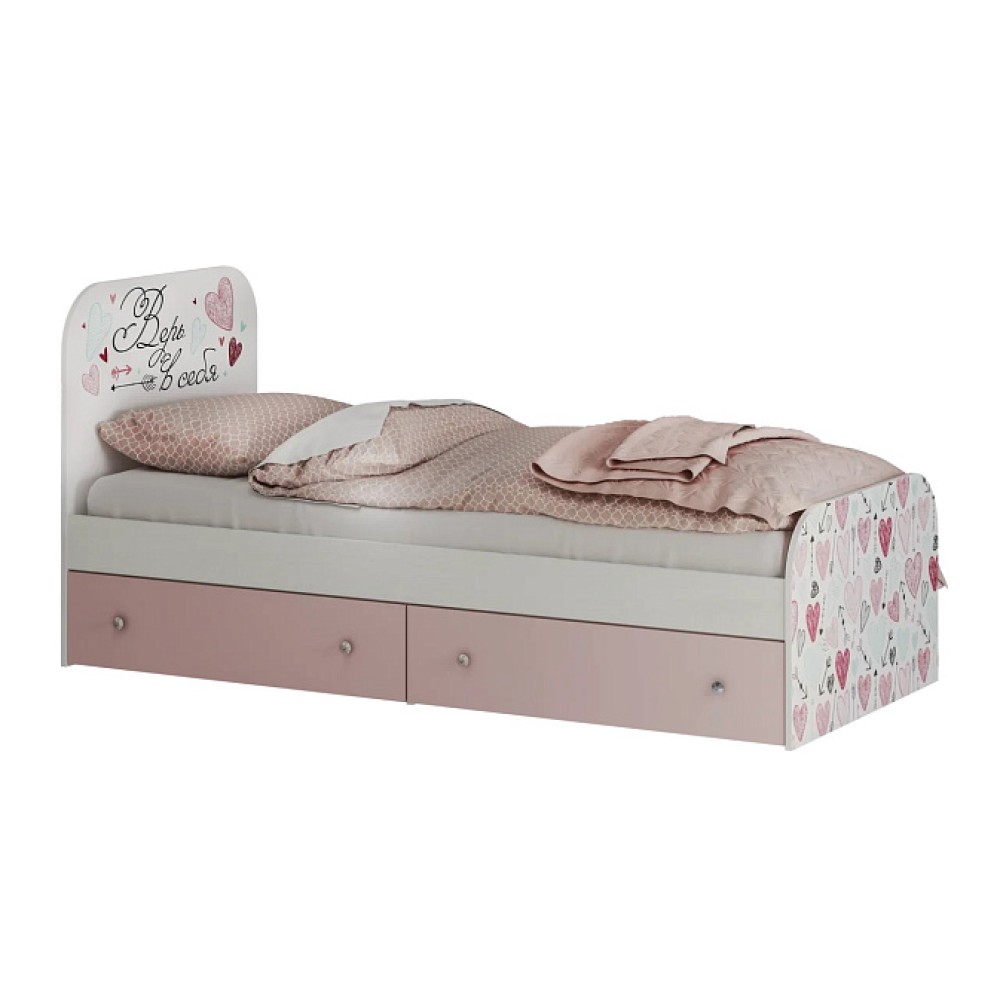 Нежные пудрово-розовые тона детской Малибу прекрасно сочетаются с классическим светлым декором корпусов и фасадов, на которые нанесен скетч-принт. Красивая и удобная кровать придется по душе любой девочке. Модель оснащена двумя ящиками, выдвигающимися с помощью изящных ручек в виде хрусталиков.