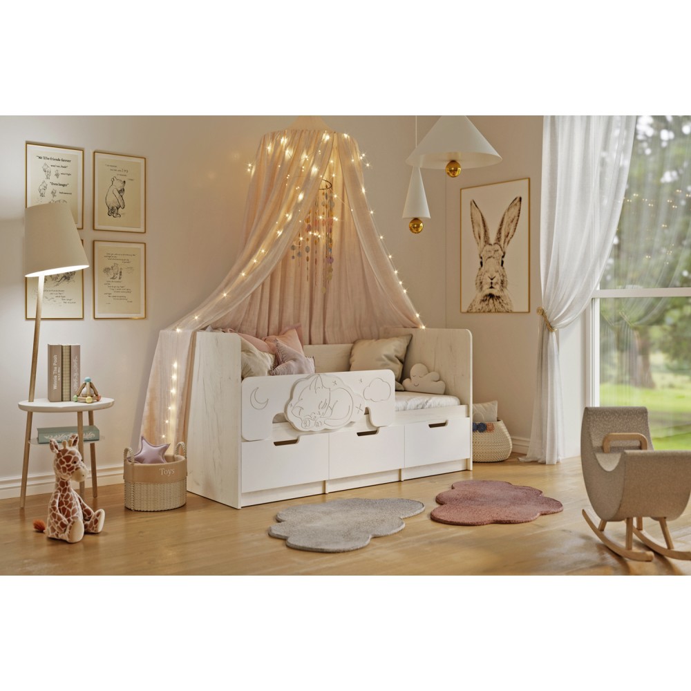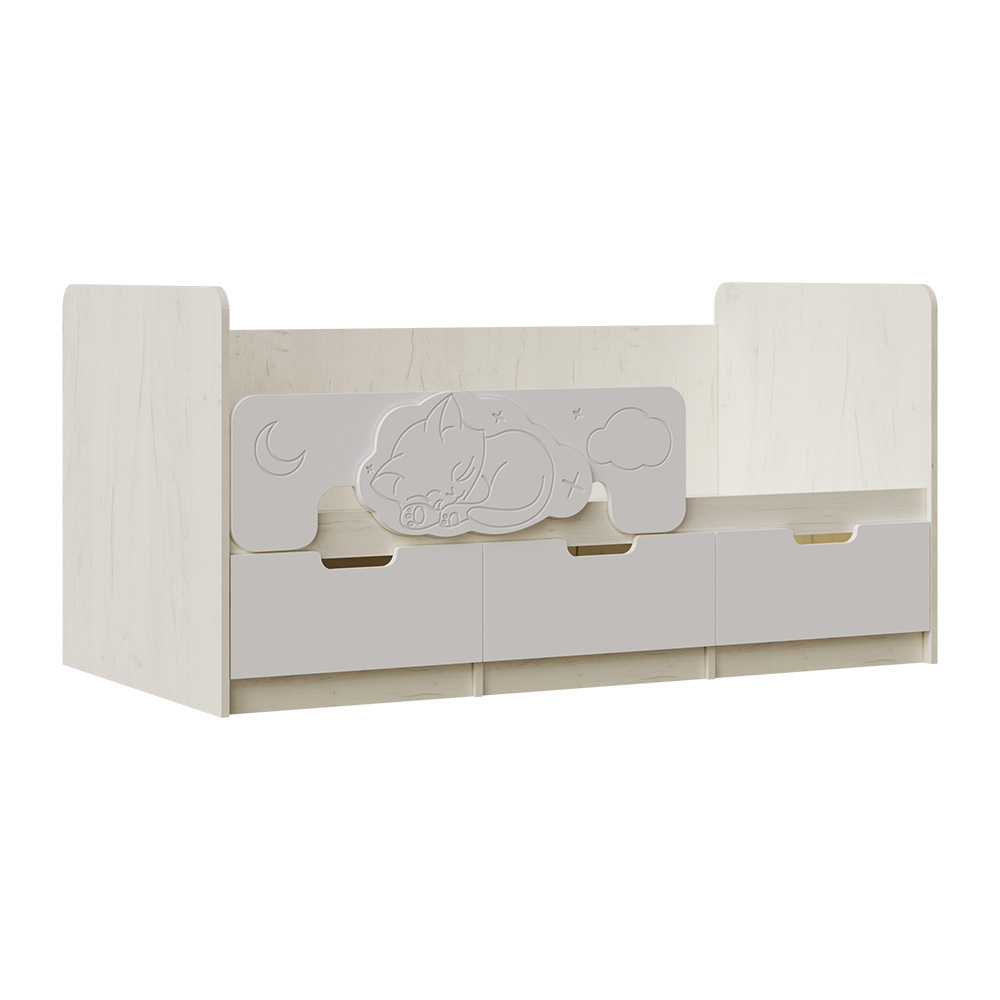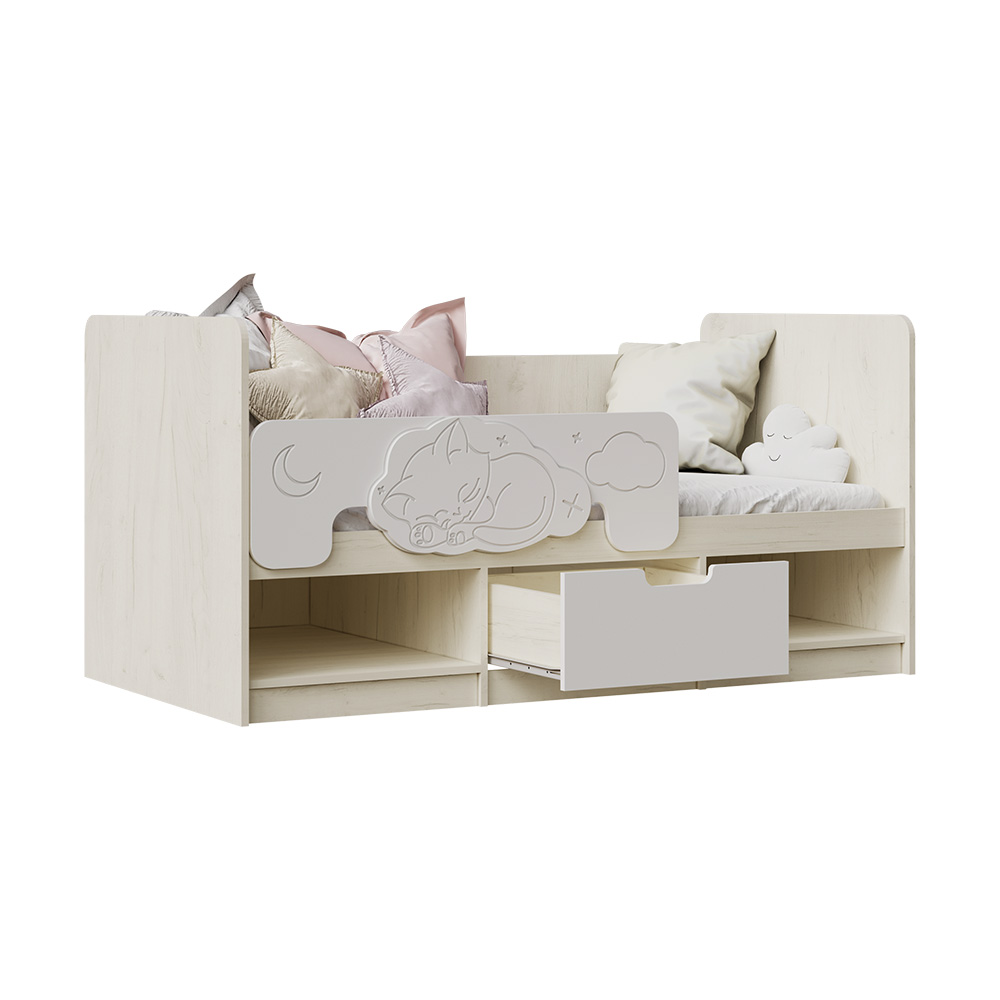 Кровать Юниор выполнена в современном стиле, который подойдёт для любого интерьера детской. Модель комплектуется ящиками, в которых вы можете разместить игрушки, постельное белье и даже одежду ребенка. На фасадах ящиков отсутствует лицевая фурнитура для большей безопасности детей.