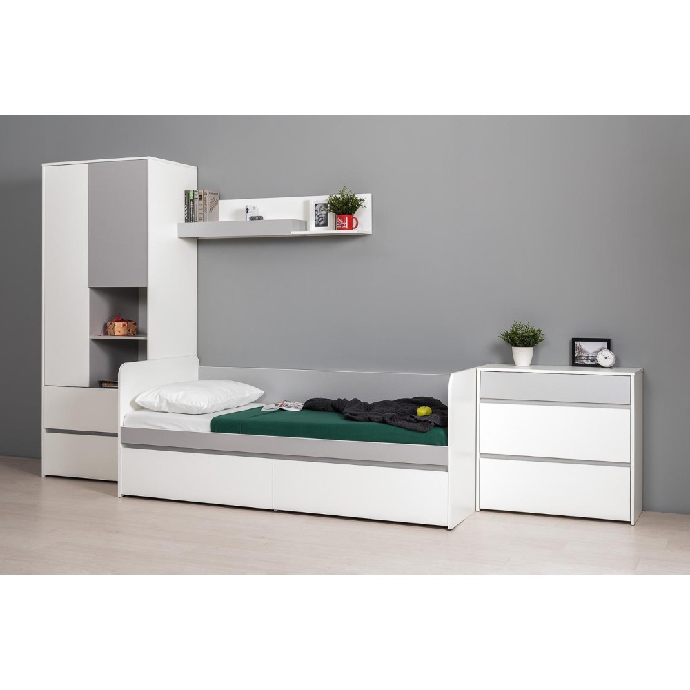 Торонто — стильная и актуальная молодёжная кровать, которая прекрасно впишется в интерьер комнаты. Базовый белый цвет в сочетании с акцентным серым создаёт нейтральную основу, позволяющую подчеркнуть индивидуальность владельца и его личные вещи. Отсутствие лицевой фурнитуры и механизм открывания фасадов за край делают кровать не только стильной, но и функциональной, так как мебель занимает меньше места и позволяет свободно перемещаться рядом с фасадами без риска травм.