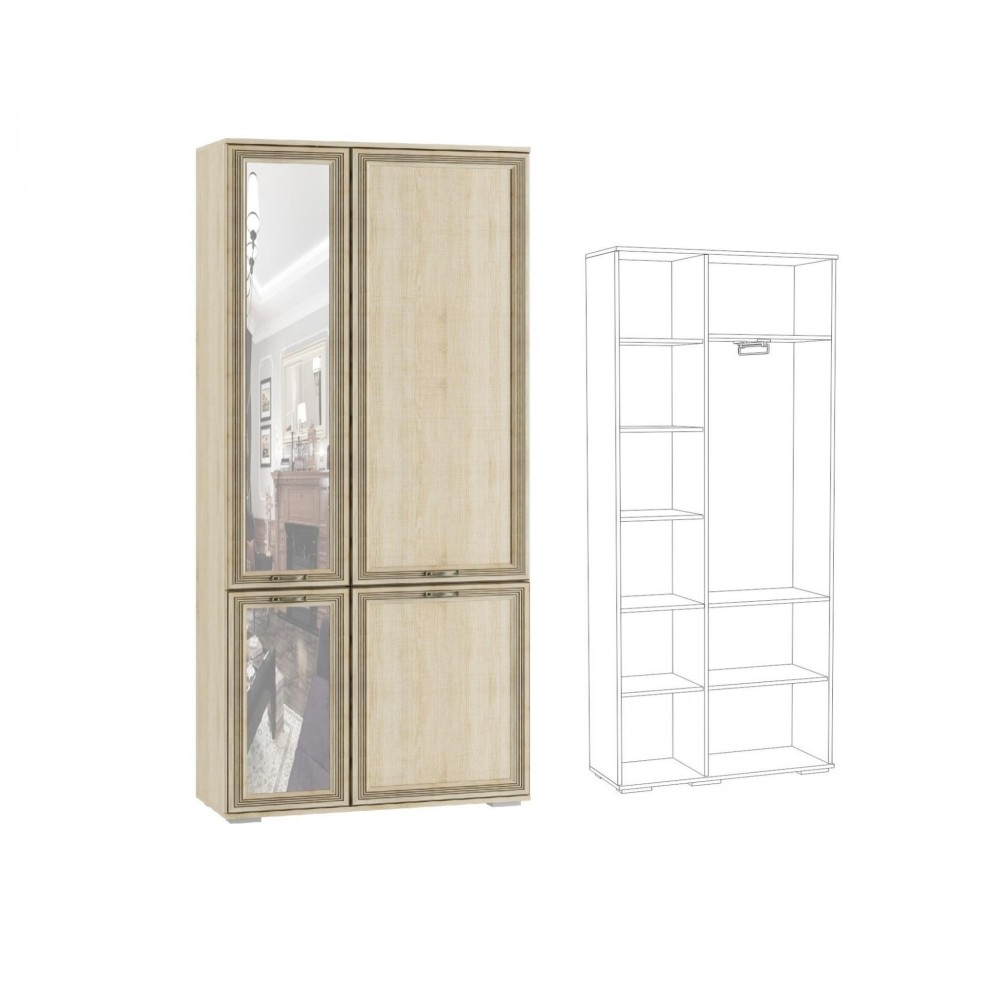 Шкаф ЛШ-9 из коллекции Ливорно совмещает в себе пенал с полками и секцию с евроштангой. Данный модуль - оптимальное решение для организации хранения одежды на плечиках и вещей в сложенном виде в гостиной комнате. Зеркальный фасад не только позволит Вам держать внешний вид под контролем, но и визуально облегчит и расширитпространство.Данный модуль отлично сочетается с другими шкафамиЛиворно.