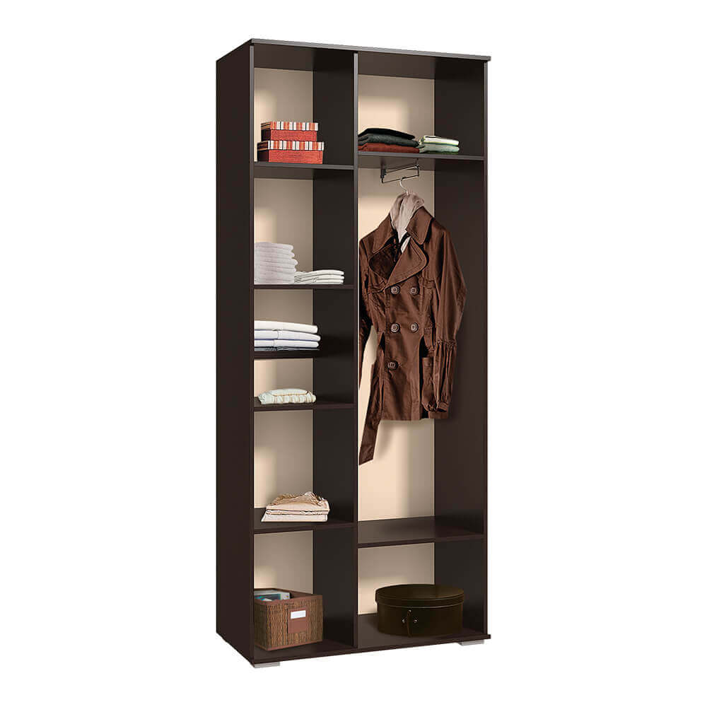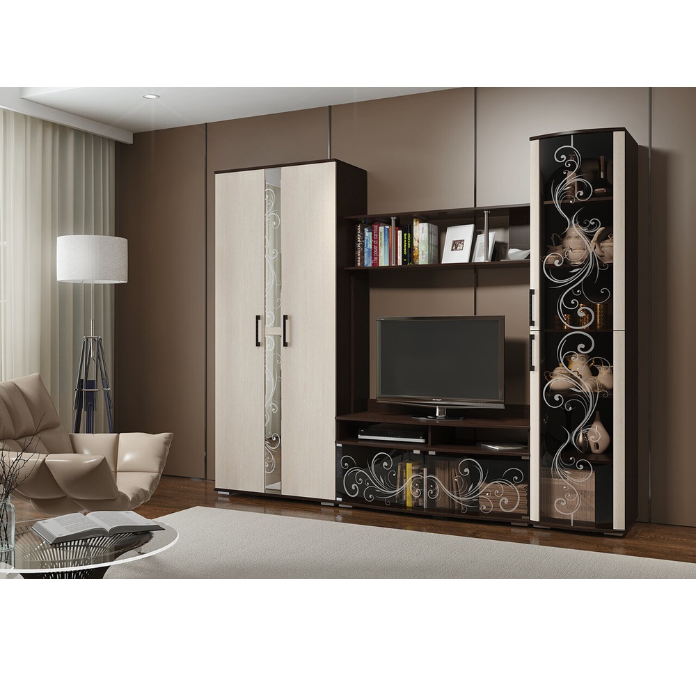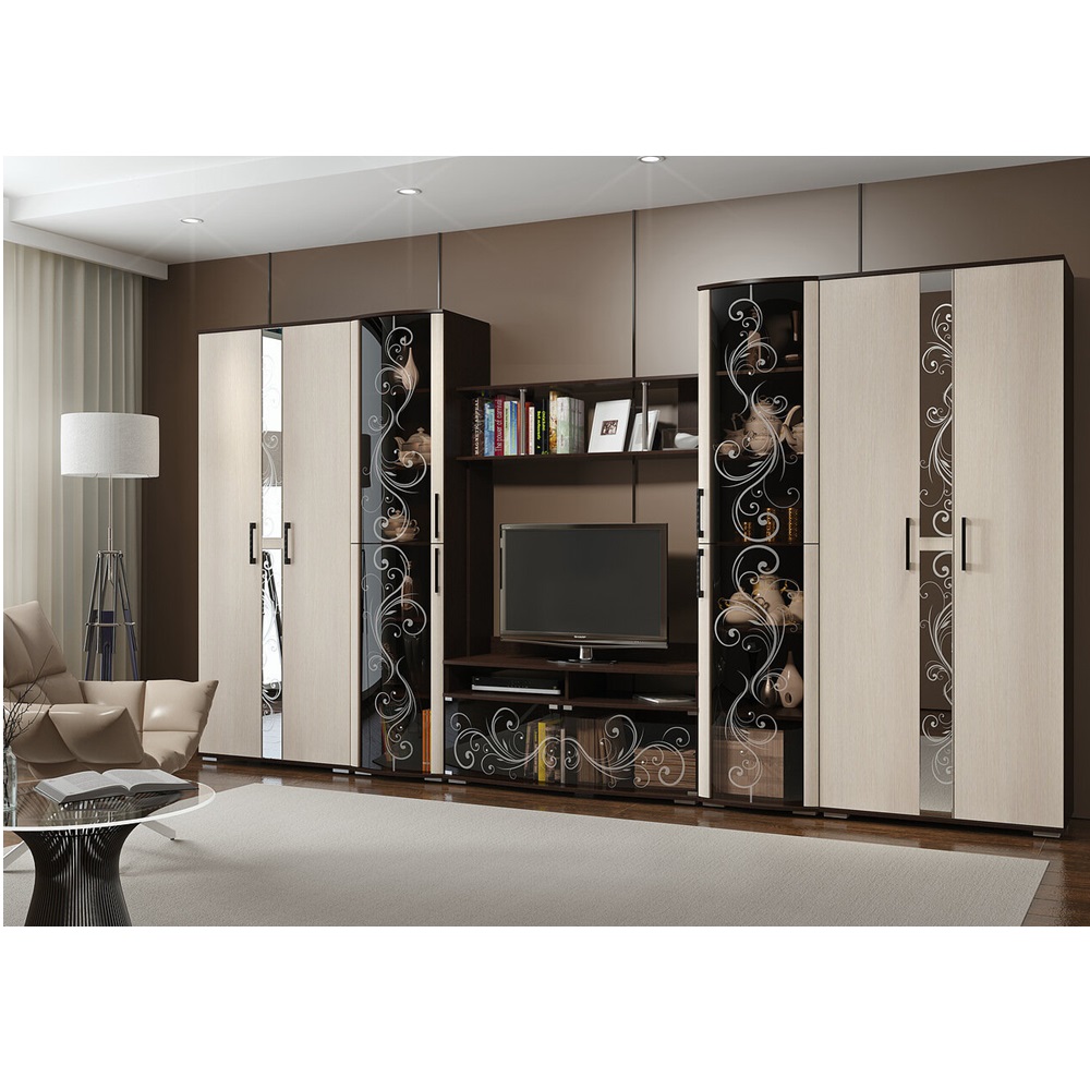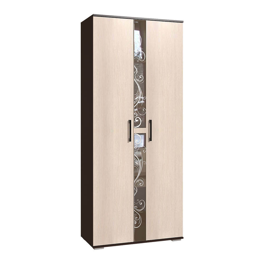 Гостиная Флоренция — это шкаф в цветах венге и дуб атланта. Он имеет двухстворчатую конструкцию и универсальное наполнение: полки и металлическую штангу для одежды. Дверцы шкафа украшены бронзовым стеклом с пескоструйной обработкой.