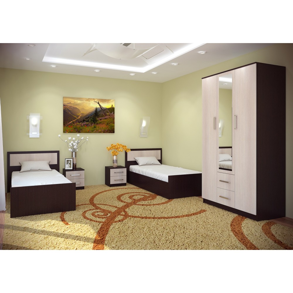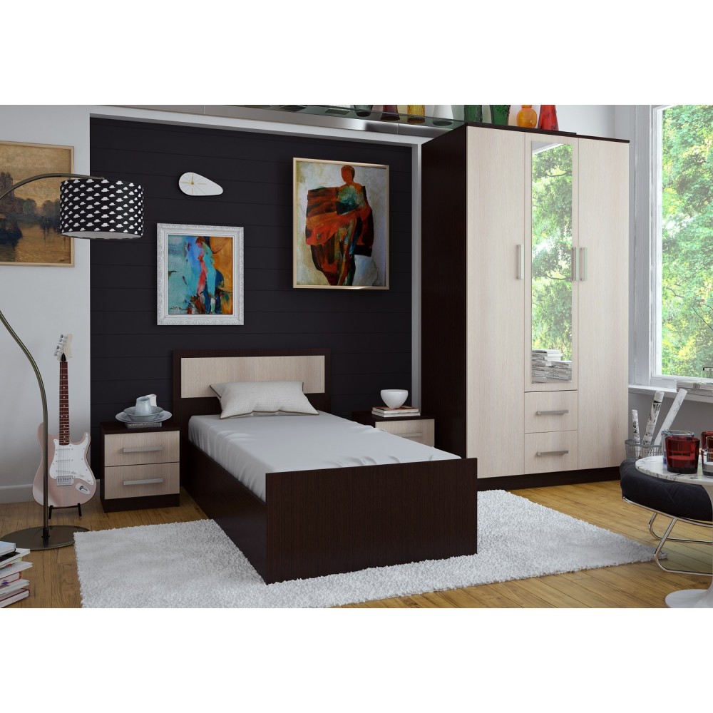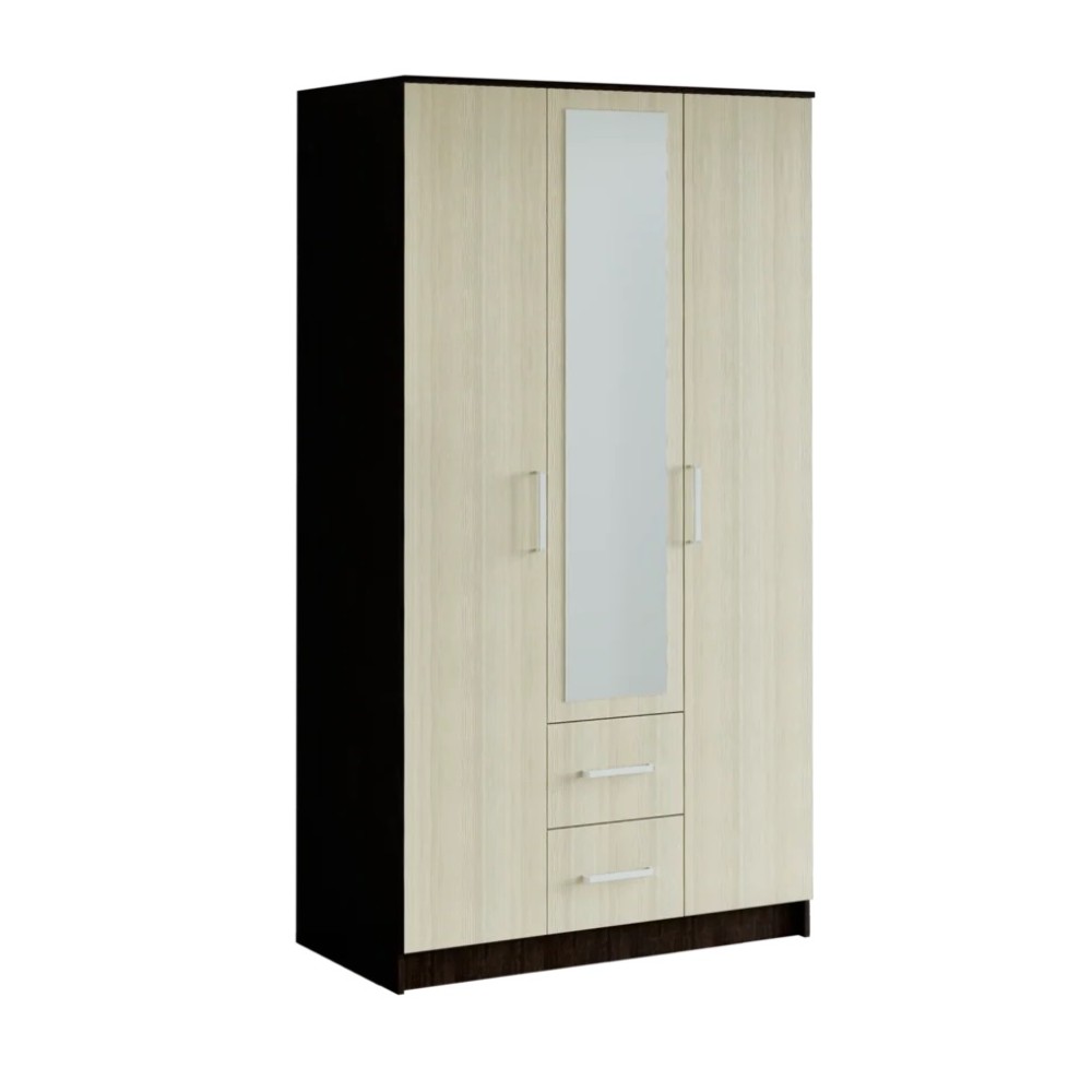 Шкаф 3-х створчатый имеет два платяных отделения, два выдвижных ящика и бельевое отделение; украшен зеркалом с еврокромкой.