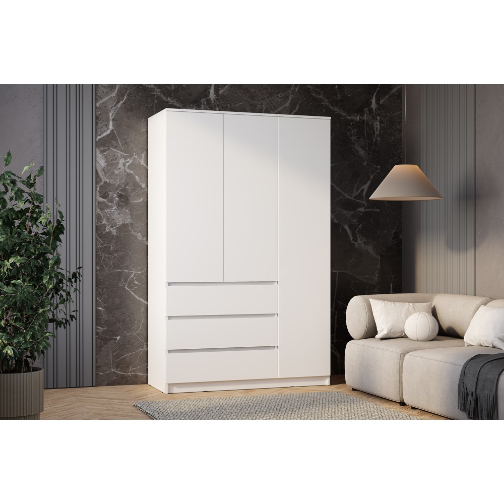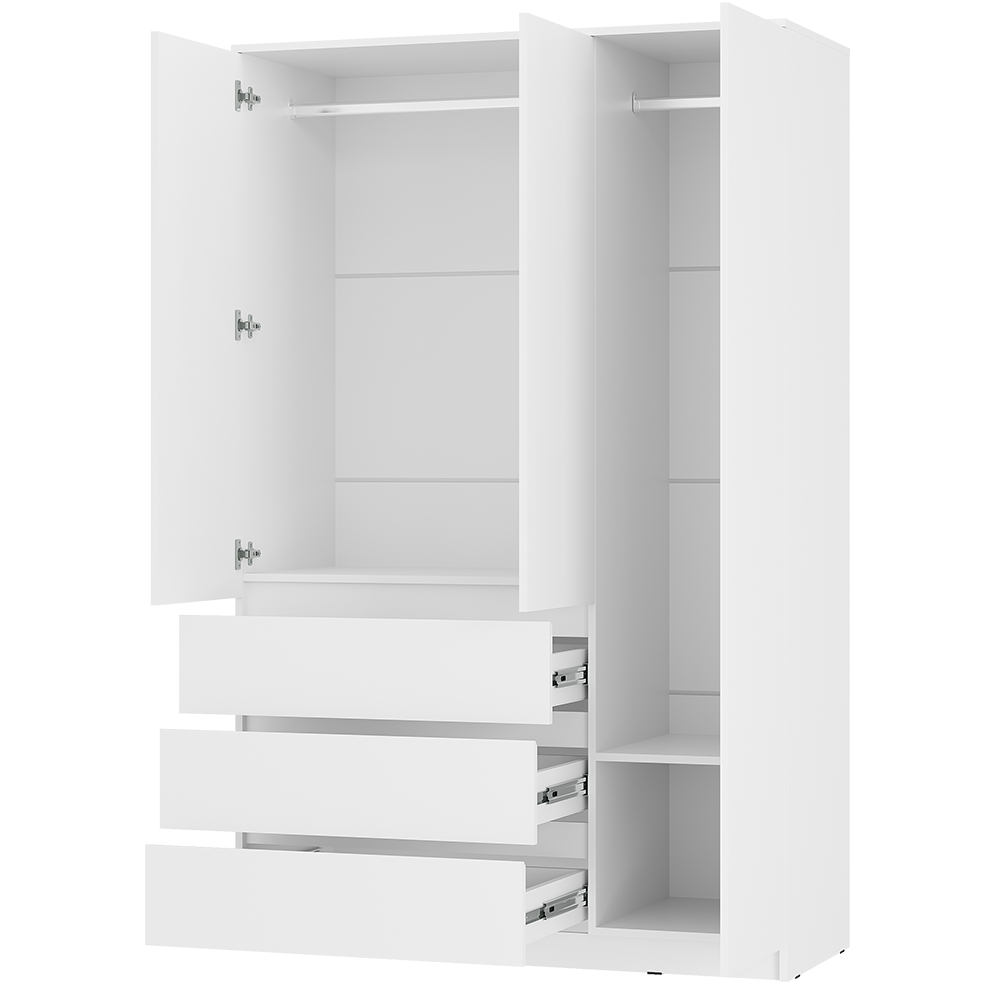 Шкаф 3-х створчатый Симпл ШК-08 - это стильное и функциональное решение для вашего интерьера. Его элегантный дизайн и современная отделка создают атмосферу свежести и простора. Внутреннее наполнение шкафа продумано до мелочей, создавая идеальные условия для хранения ваших вещей. Стационарная штанги позволят Вам с лёгкостью повесить любимую одежду, включая платья, рубашки и жакеты, обеспечивая им идеальный вид и доступность. Также шкаф оборудован тремя ящиками на шариковых направляющих.