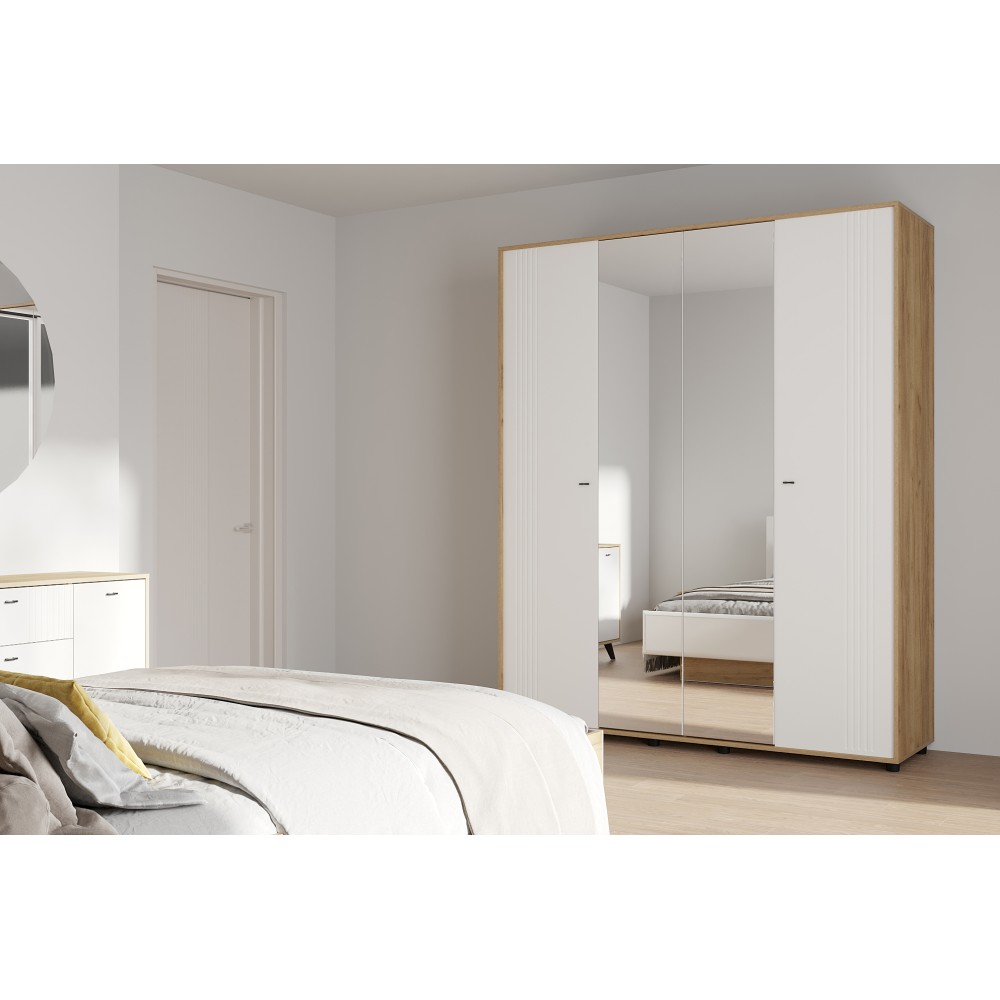 Выбирая вместительный шкаф в спальню или просторную прихожую, обратите внимание на четырехстворчатый шкаф с зеркалами из серии Милан. Две зеркальные створки, полки для белья, штанга для одежды - все Ваши вещи будут храниться в одном месте в порядке. Цветовая гамма шкафа визуально увеличит пространство и позволит вписать модуль в любой современный интерьер.