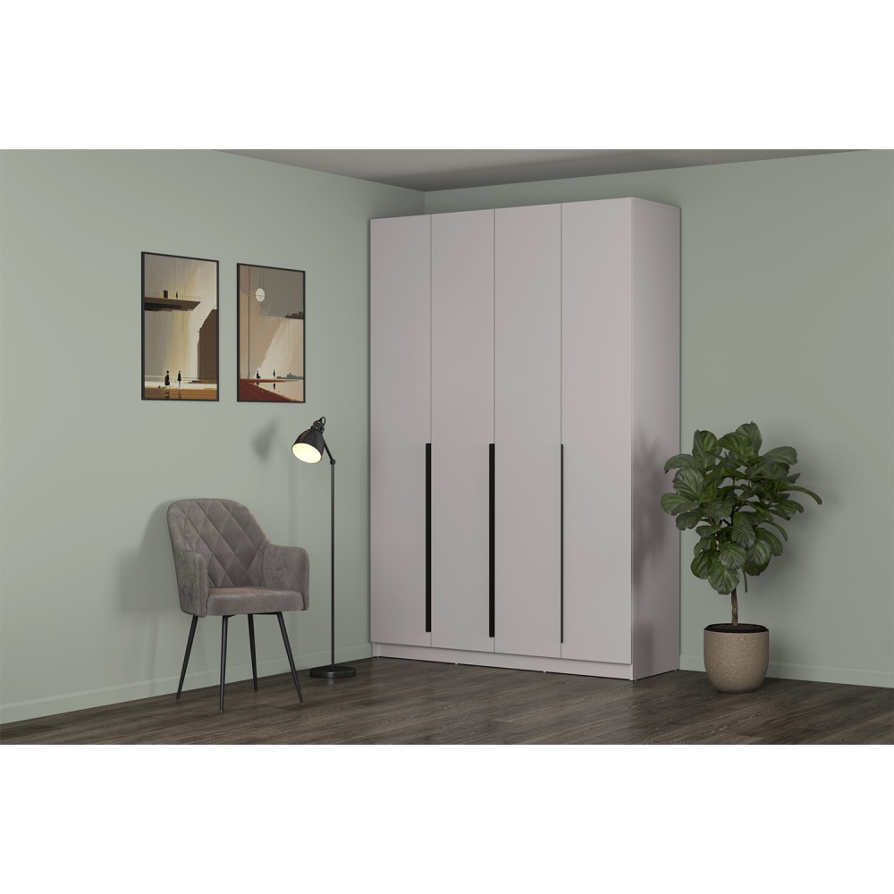 В дизайне ничего лишнего, внутреннее пространство шкафа разделено на несколько уровней и полок, что позволяет организовать одновременное хранение одежды, обуви, аксессуаров и других предметов различных размеров. Четыре распашных двери с удобными ручками обеспечивают удобный доступ к содержимому. В среднем отделении за 2 дверьми расположена штанга, антресольная полка и полка для обуви. За боковыми дверцами – по 5 полок. Заднюю стенку шкафа усиливает дополнительная панель – она укрепляет модуль и делает его более прочным.