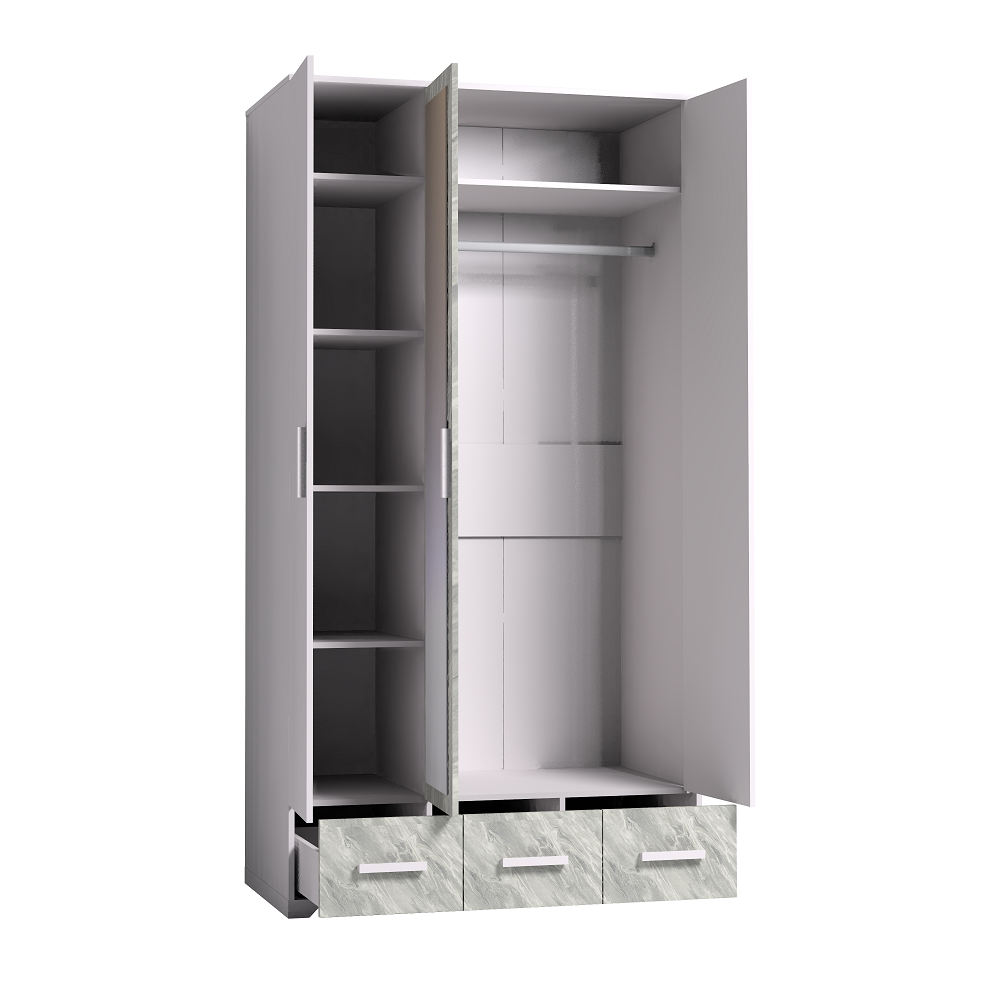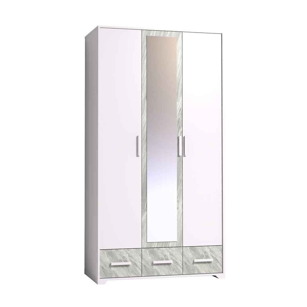 Трехдверный шкаф из коллекции Айрис - лучшее решение для организации хранения в малогабаритной спальне. Сделав выбор в пользу данной модели, Вам не придется докупать дополнительно комод или тумбу: разноплановое наполнение позволитразместить все вещи, от деликатной одежды на плечиках до белья и аксессуаров. Модель оснащена вместительной продольной штангой, комплектом полок и 3-мя ящиками полного выдвижения для максимальной вместимости. Зеркало на центральном фасаде визуально облегчает конструкцию шкафа и добавляет ему функциональности. Для максимальной безопасности крепится к стене за подвесы.