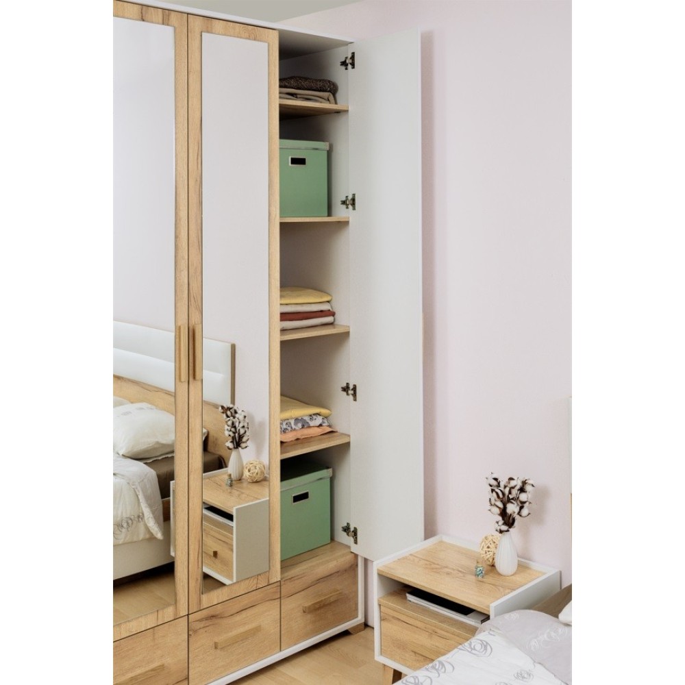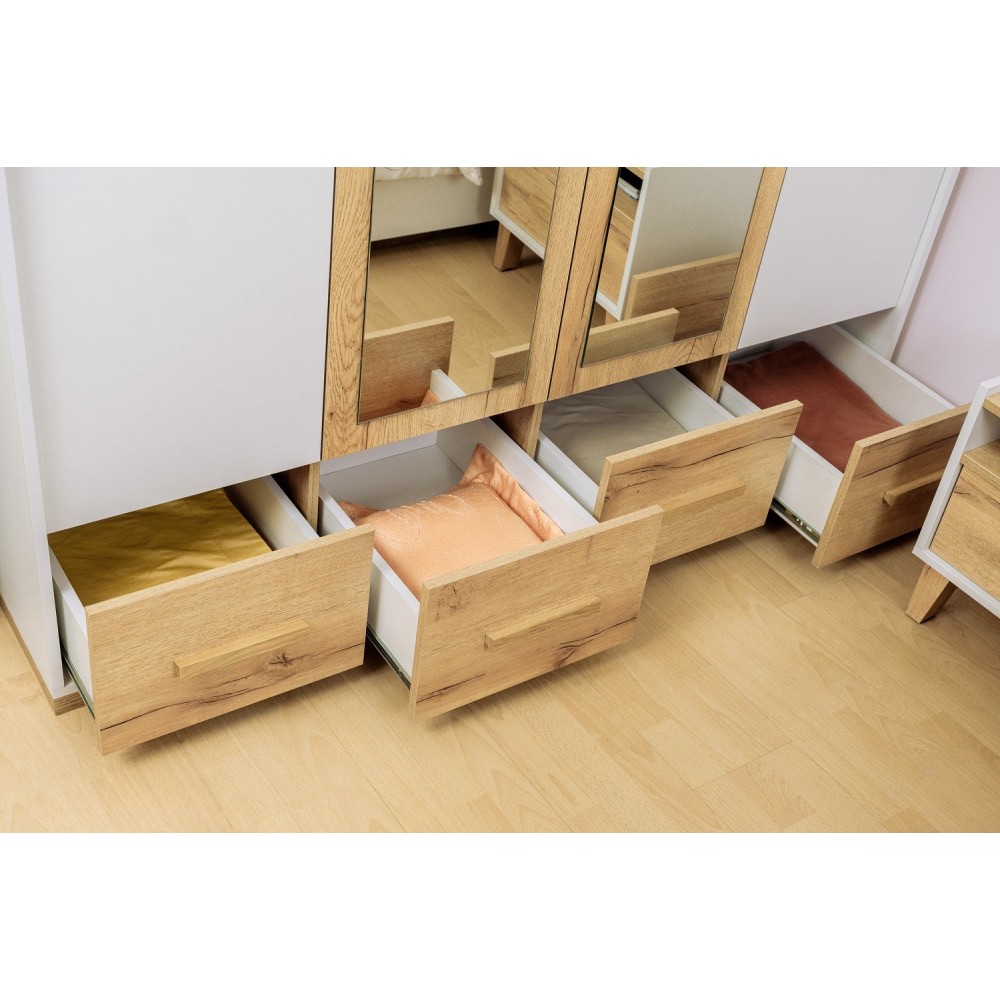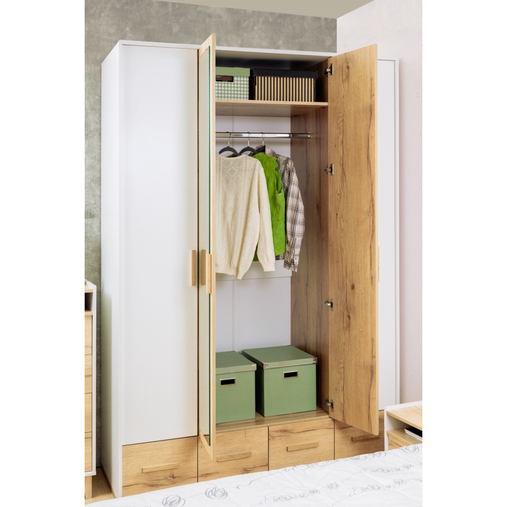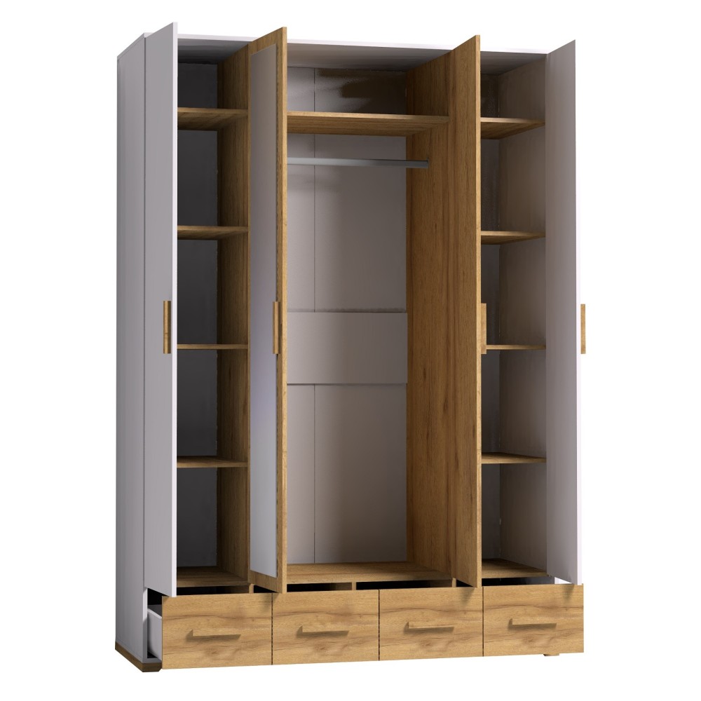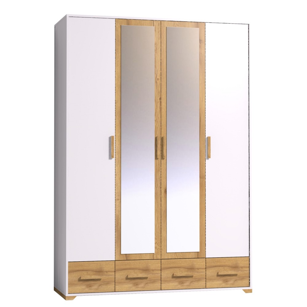 Хотите грамотно обустроить хранение в спальне? Вместительный четырехдверный шкаф из коллекции Айрис решит эту задачу. Продуманное до мелочей наполнение шкафа позволит Вамзонировать хранение одежды всех членов Вашей семьи. По бокам модуля имеется комплект полок для вещей в сложенном виде, центральная секция оснащена продольной штангой для деликатной одежды на плечиках и длинной полкой для коробок. Максимальная нагрузка на штангу - 40 кг. В четырех выкатных ящиках на шариковых направляющих плавного и бесшумного выдвижения хватит места для постельных принадлежностей, текстиля, белья и аксессуаров. Приятное сочетание древесного оттенка с белым и комбинированный зеркалом фасад визуально облегчит и расширит пространство Вашей спальни. Модуль крепится на стену за подвесы.