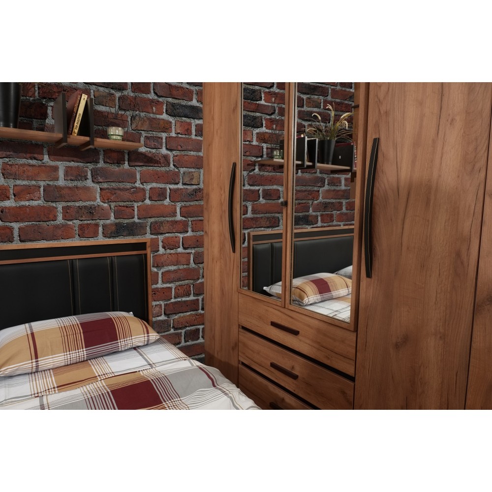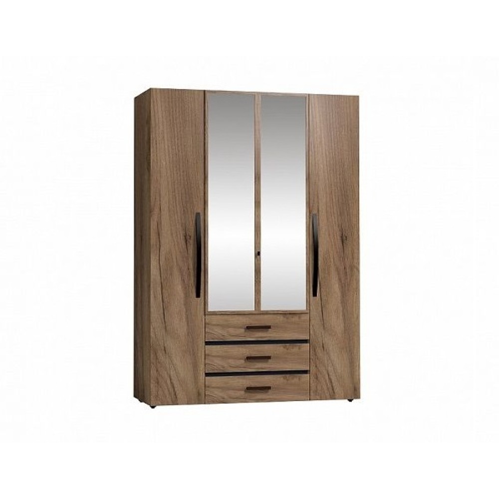 Вместительный распашной шкаф красивого древесного оттенка с 2-мя зеркальными фасадами прекрасно подойдет в небольшую спальню. Функциональное наполнение шкафа разделено на две симметричные половины, что очень удобно для пользования и зонирования гардероба всех членов семьи. За глухими фасадами скрываются отделения с 4 полочками, регулируемых по высоте, что делает хранение одежды и аксессуаров крайне удобным. Зеркальные фасады шкафа обрамлены вставками из ЛДСП. Изнутри зеркало покрыто специальной защитной пленкой, которая предотвратит падение осколков, если оно разобьется. Элегантная ручка-петля позволит открывать дверцу, не прикасаясь к зеркальному полотну, а, значит, его не придется часто протирать. Вторая зеркальная дверца открывается за свес. Внутри шкафа закреплена стационарная штанга (777 мм), которая выдержит нагрузку в 40 кг. Особенно деликатные вещи, постельные принадлежности и другие предметы быта помогут хранить три выкатных ящика с глубиной 40 см. Ящики оснащены шариковыми направляющими полного выдв